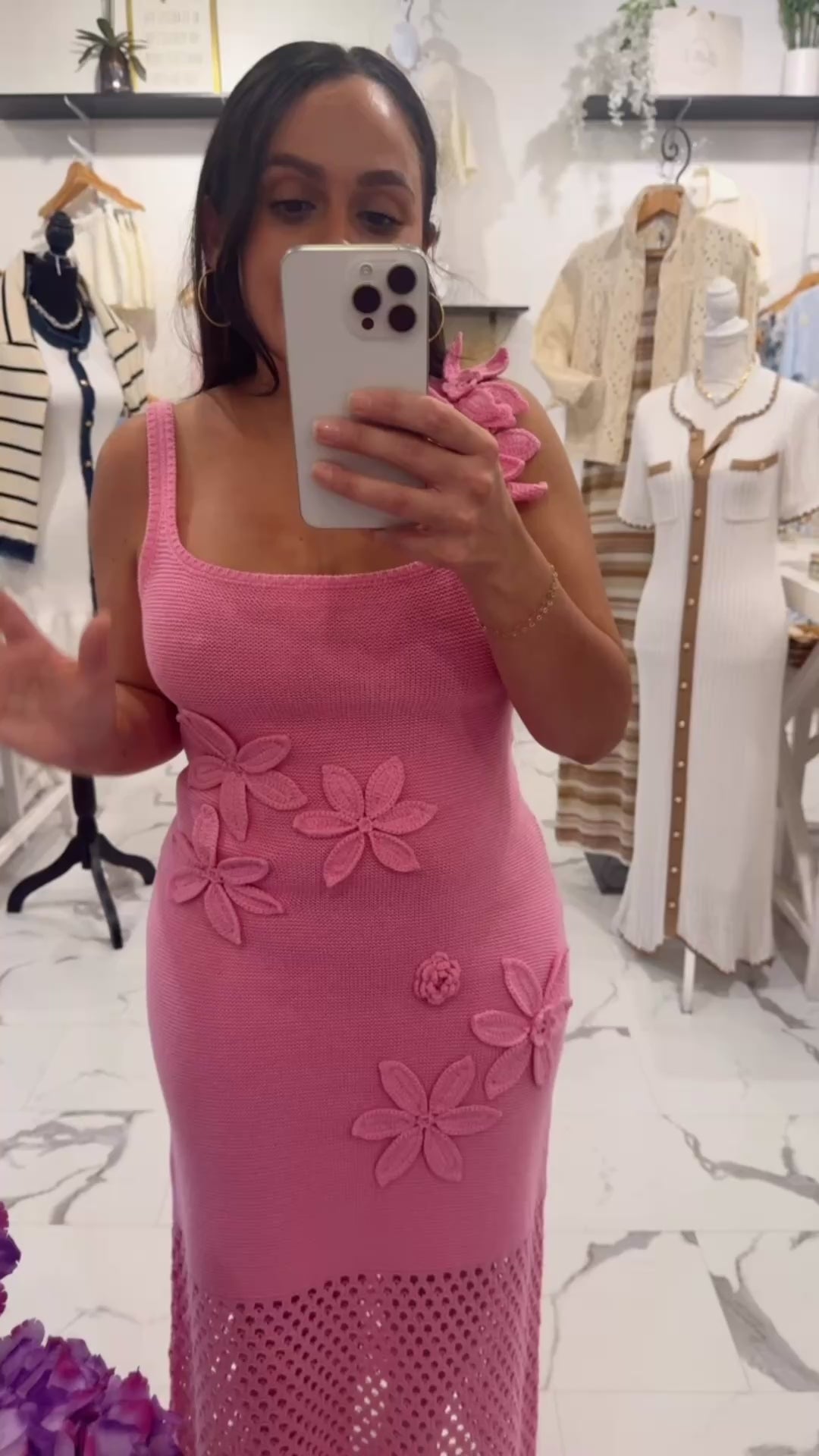 Our Stop & Stare Petal Knit Dress is exactly what its name promises! Feminine, eye catching, and designed to stand out in the prettiest way. This soft pink knit midi features a flattering, body hugging silhouette with delicate floral appliqués that feel playful yet elevated.