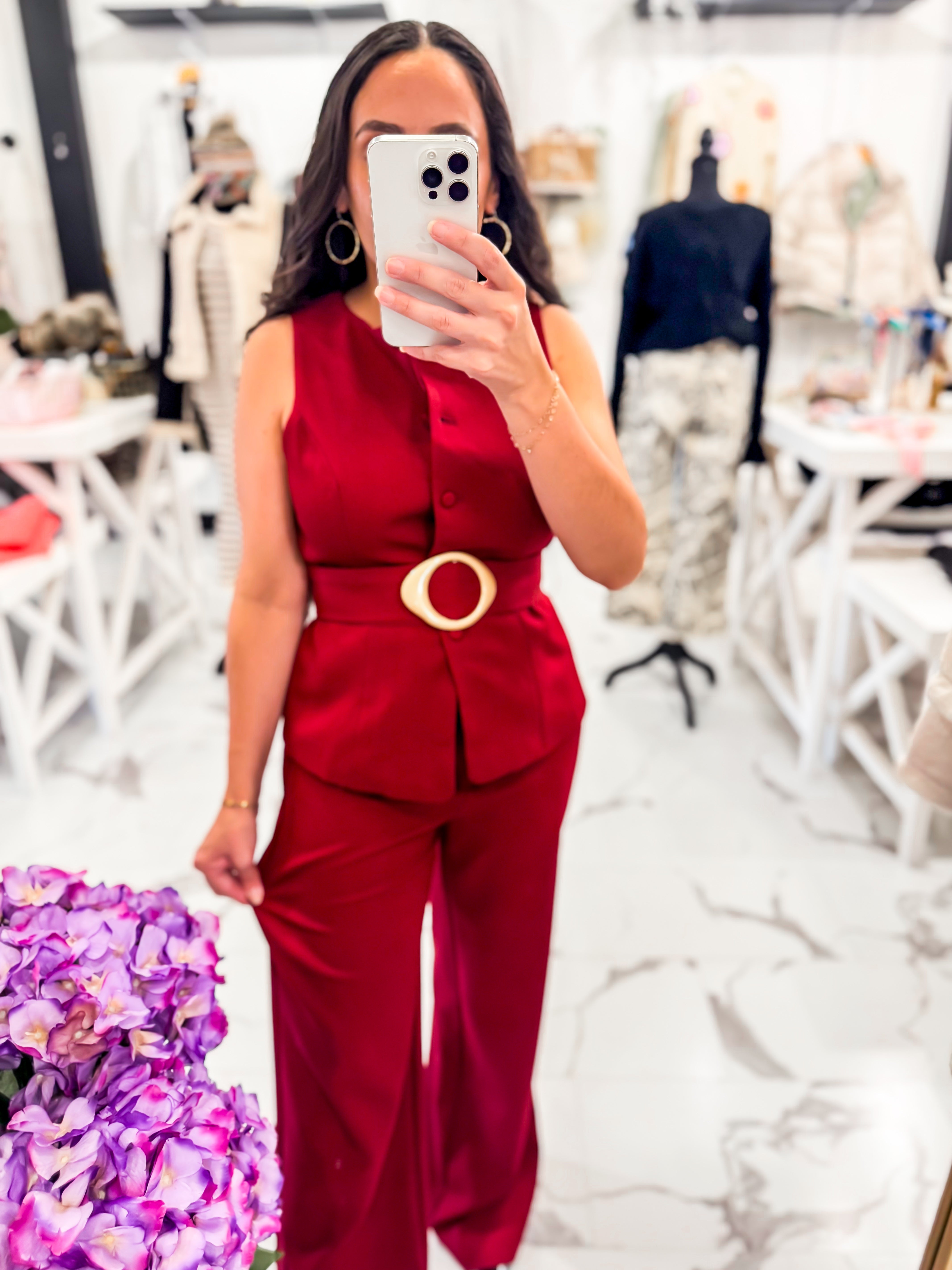 Our Feminine Edge Trousers are the cutest berry statement piece! Designed in a bold wine hue, these straight leg trousers will keep you feeling flattered and structured. The mid rise waistband flatters your waist, while the straight leg cut keeps things professional. Pair them with the matching top, Angela Ring, Perla Necklace, and heels.