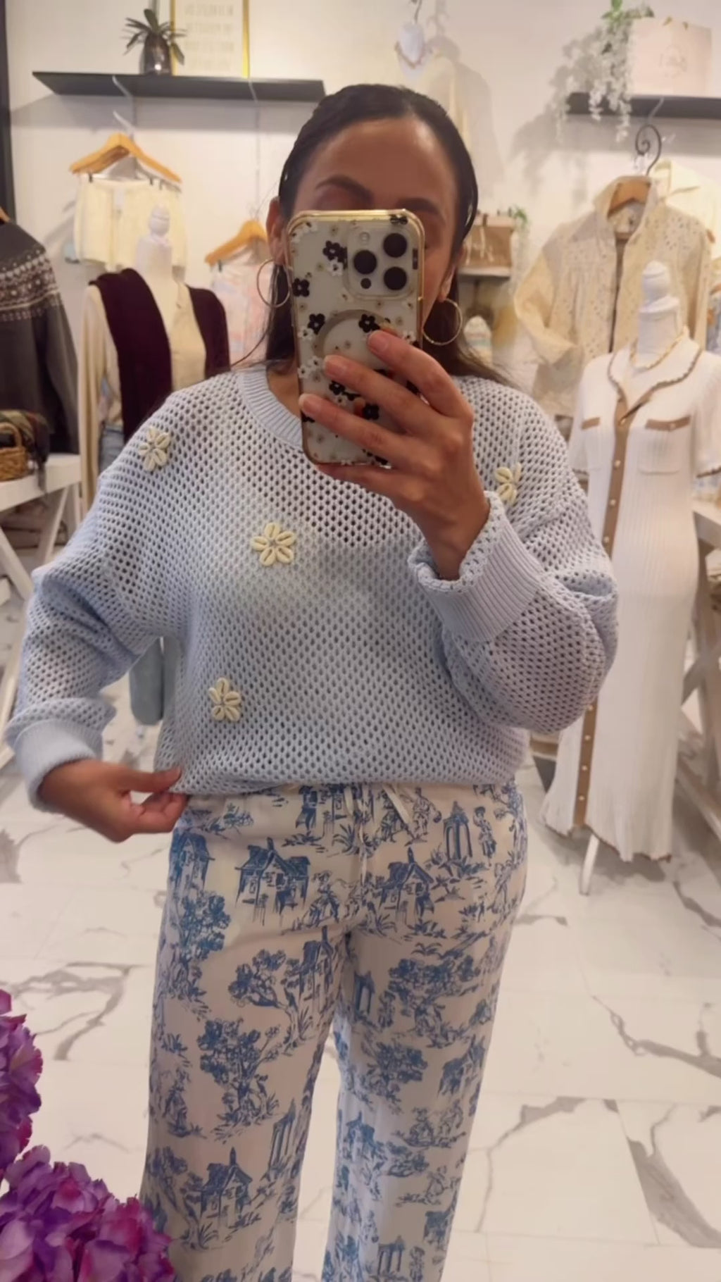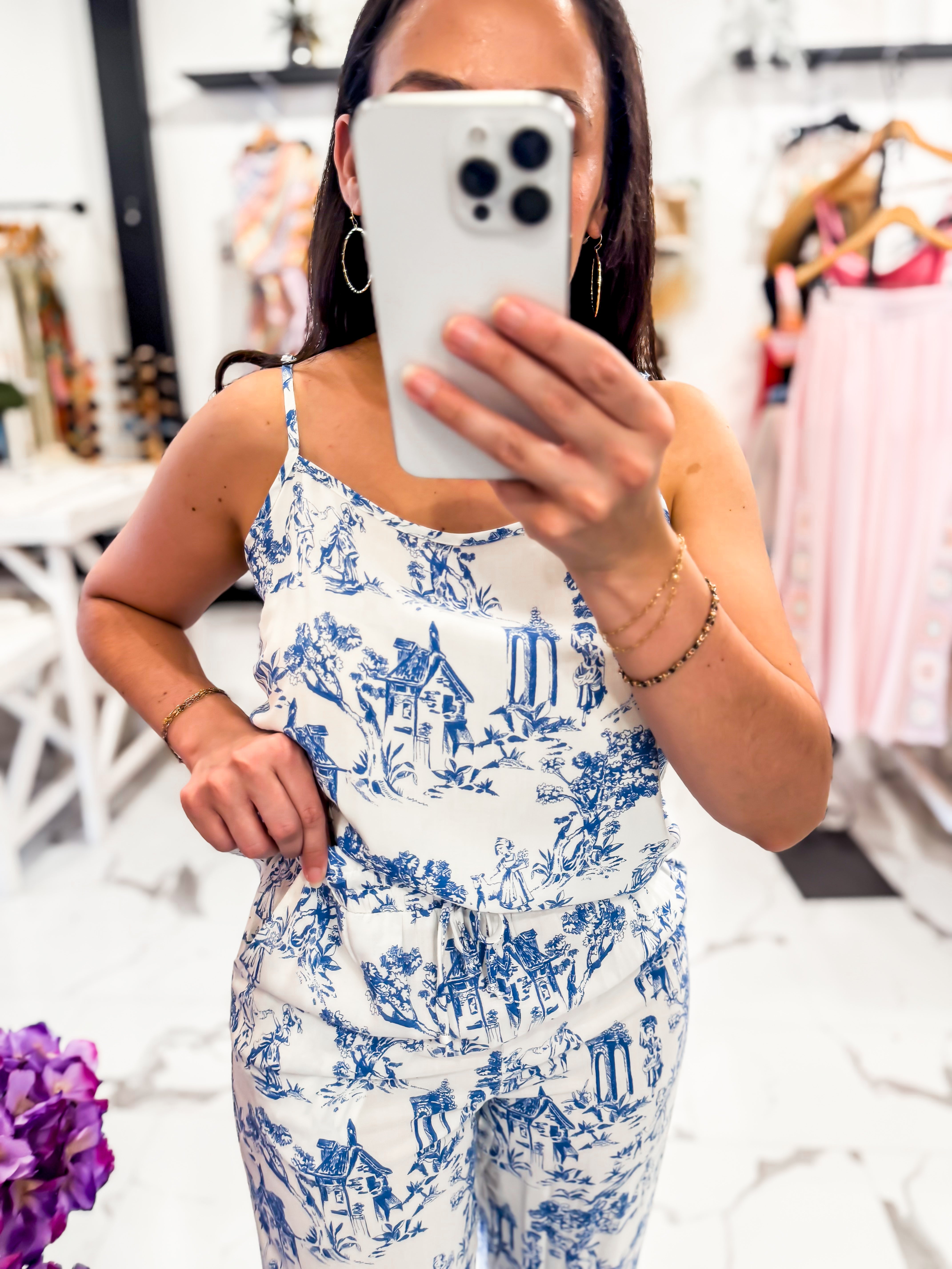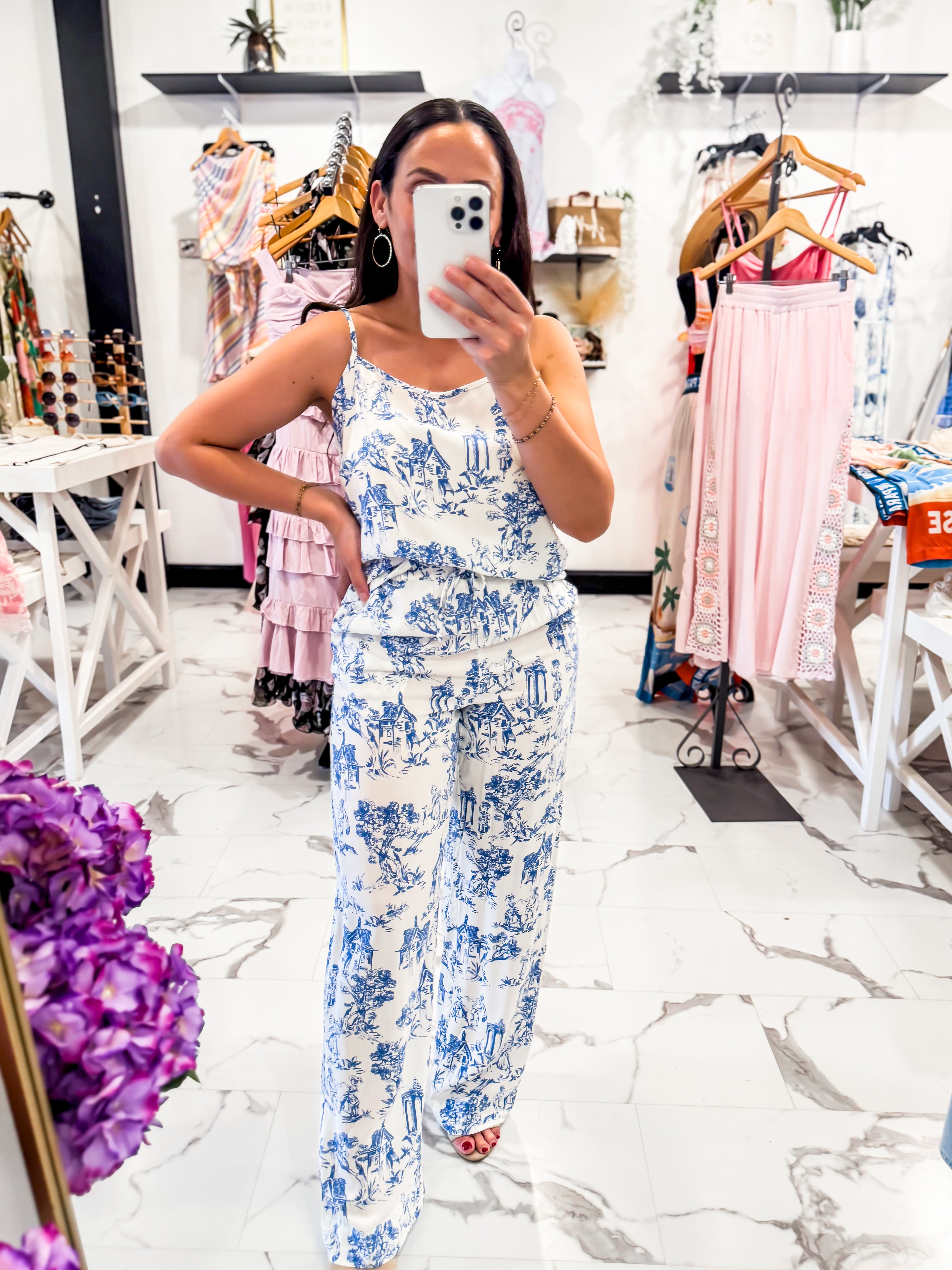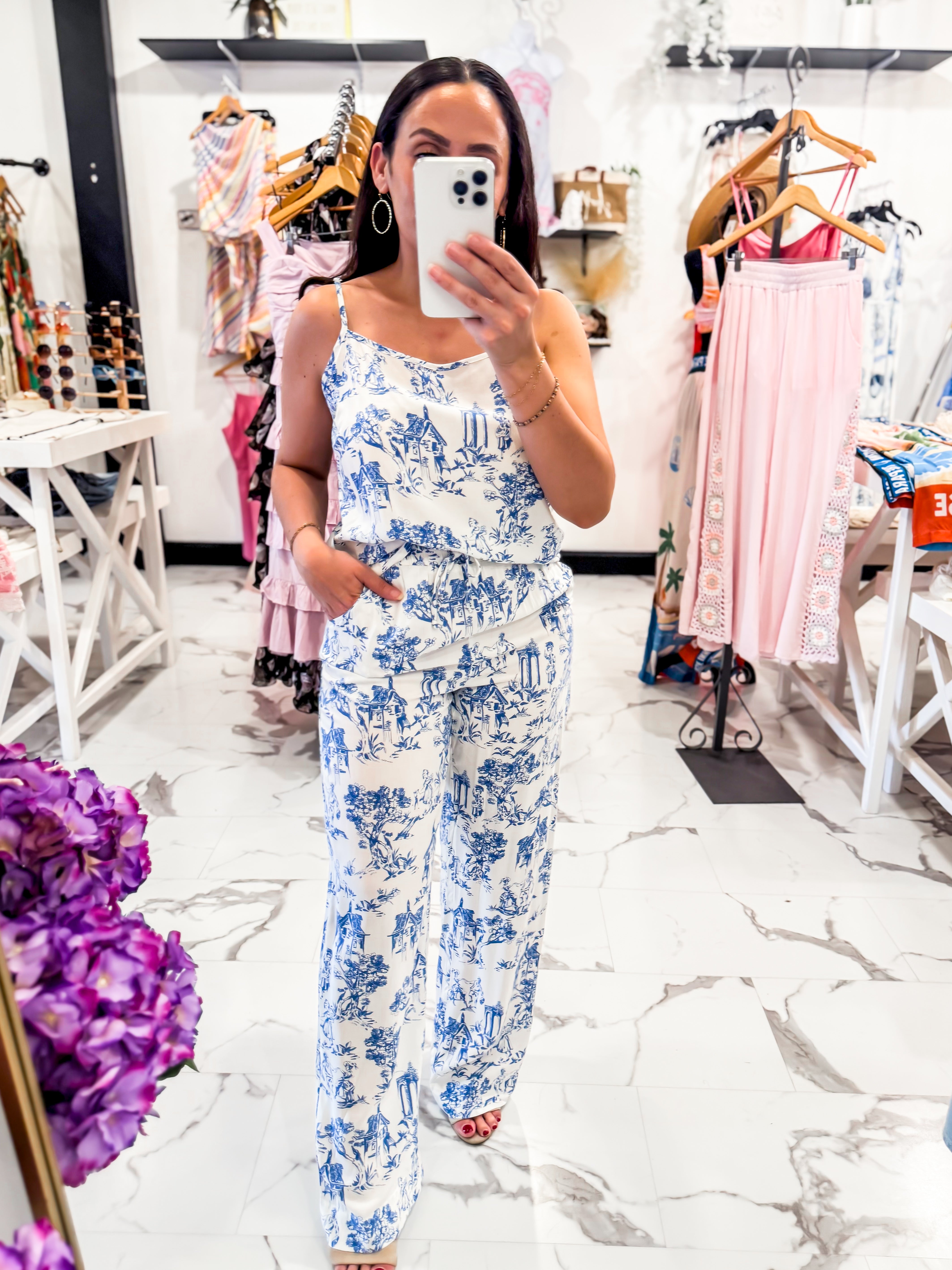 Some outfits just make you feel instantly chic and these pants are one of them! The French Countryside Printed Pants feature the same dreamy blue toile inspired print that feels like it belongs in a charming European village. Designed with a comfortable elastic waistband and adjustable drawstring tie, these pants are as easy to wear as they are beautiful. The lightweight fabric and relaxed, wide leg silhouette create a flattering, flowy fit that moves effortlessly with you. Pair it with our Little Things Knit, Shirley Ring, and wedges.