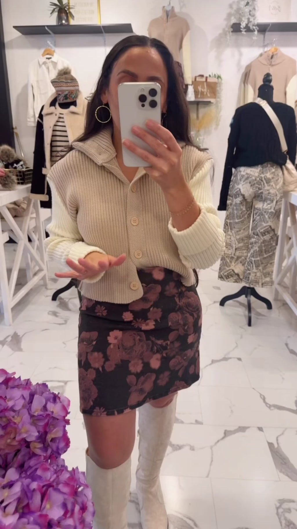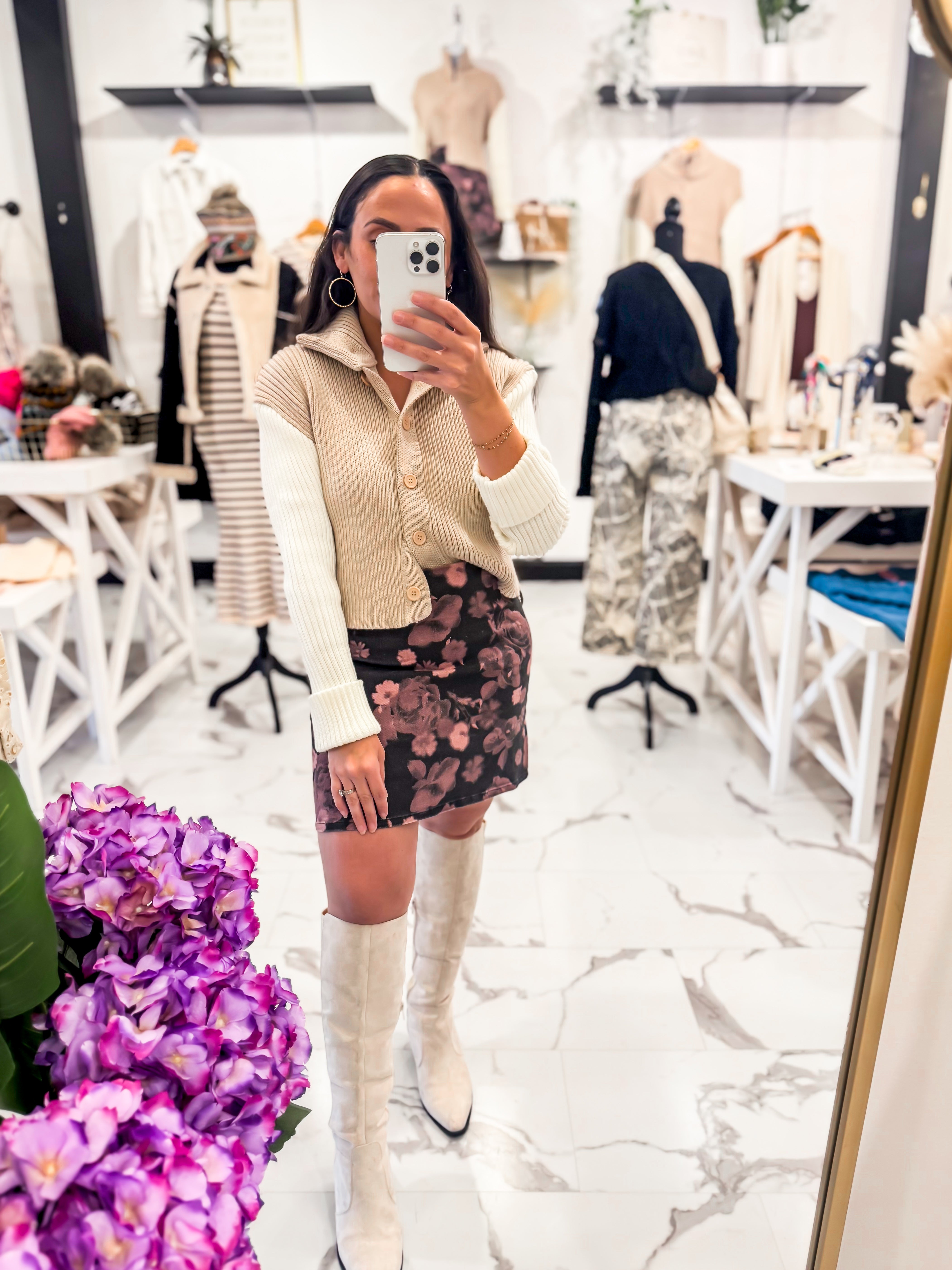 Floral done the Bella V way.. timeless with just the right touch of edge! The Rust & Rose Floral Mini Skirt is the perfect mix of sweet and sultry, featuring a soft brushed texture and a muted mauve floral print against a chic black base. Designed with a flattering high waist fit and subtle stretch, this mini hugs in all the right places while keeping comfort top of mind. Pair this mini skirt with our Alpine Club Color Block Sweater, Aubrey Hair Bow, Gemma Ring, and tall boots.