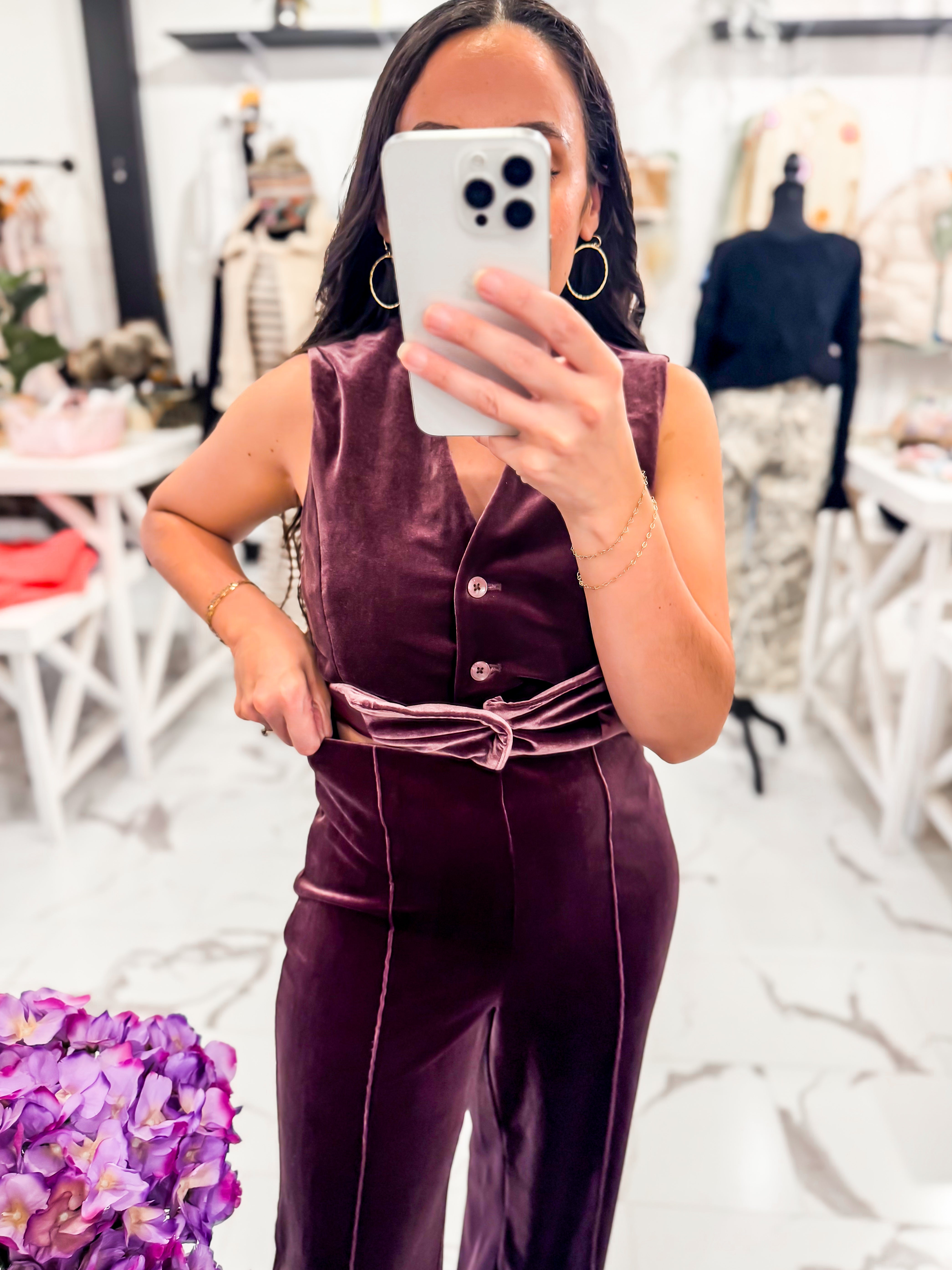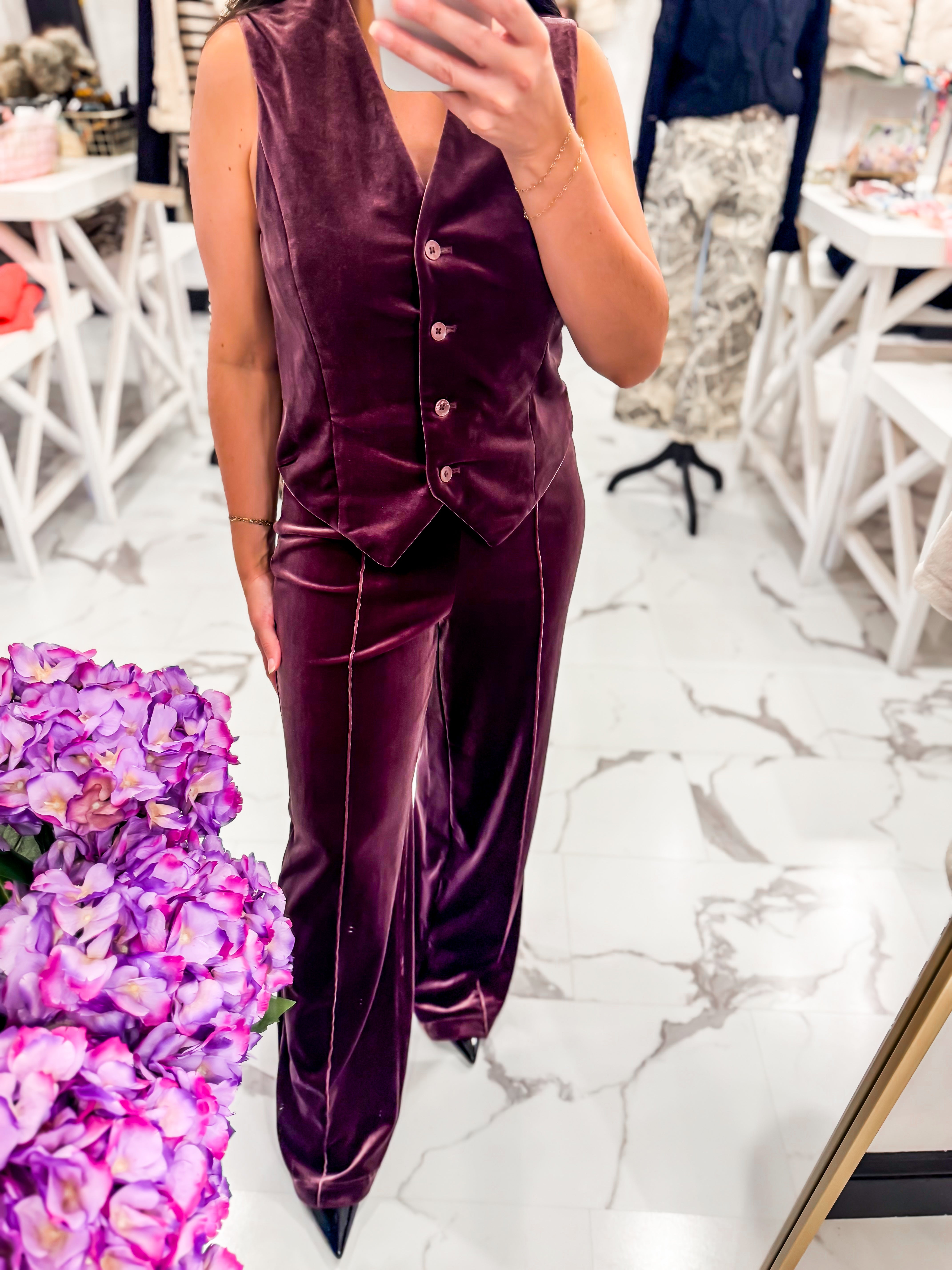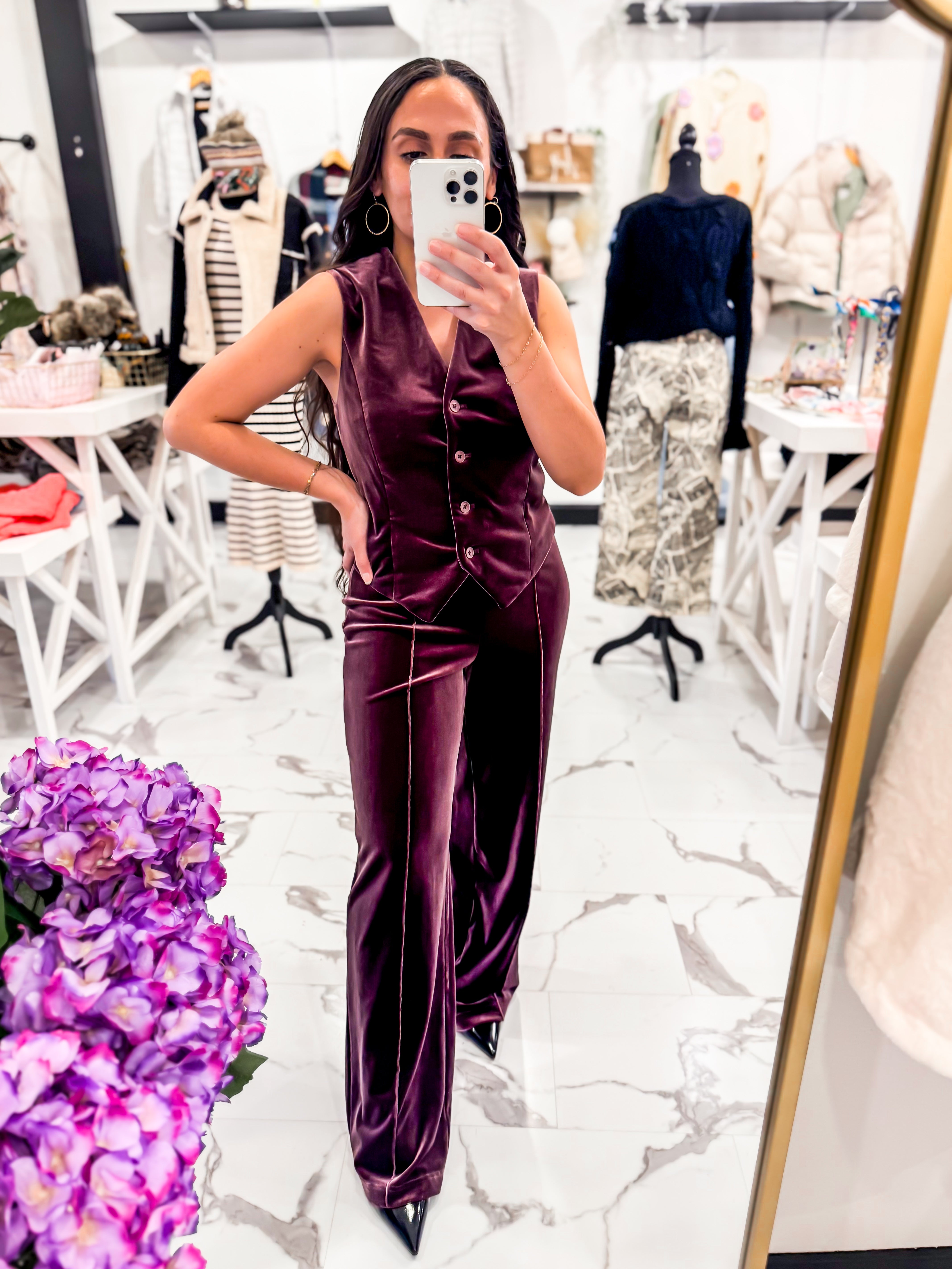 Sophisticated meets sultry in the most luxurious way! The Velvet Affair Trousers are a statement on their own, rich in color, soft in texture, and tailored to flatter. Crafted from a stretch velvet that moves with you, this high waisted silhouette features an elastic waistband accentuate your waist and a sleek straight leg fit that elongates your frame.Pair them with the Heart On The Line Top, Shannon Ring, Leila Earrings, and boots.