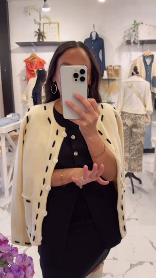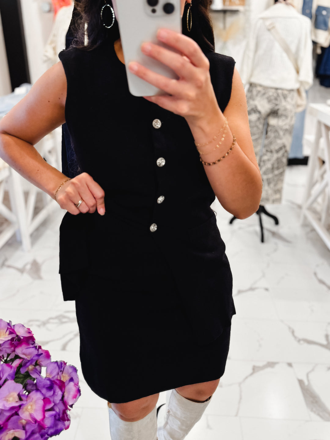 Elevate your look with our effortless but adorable Way Too Good set. This black two piece features a tailored sleeveless top vest with a round neckline, structured seaming, and silver buttons down the front. The skirt is a mini length and made with a soft, stretchy fabric designed for comfort. Add our Ada Ring, Cara Earrings, Birch Cardigan, and heels.