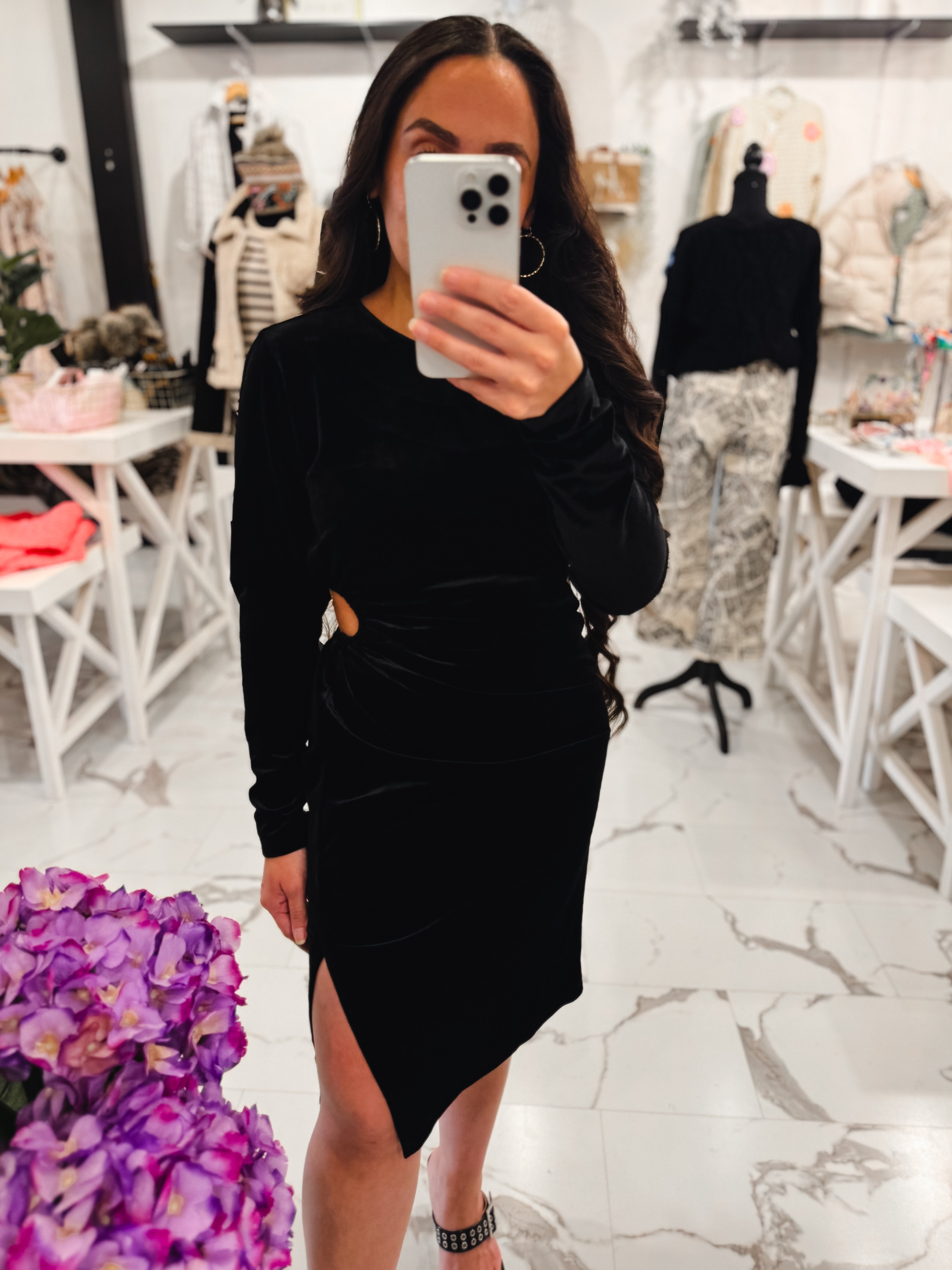 A classic silhouette with a daring twist! Our After Dark Midi Cutout Dress brings sophistication and allure together in one sleek statement. Crafted from smooth stretch velvet, this dress features a flattering body skimming fit, a subtle side cutout, and an asymmetrical slit hemline for that unexpected touch of drama. Effortlessly refined yet unapologetically bold, this is your go to for nights that call for understated luxury. Rock this dress with our Adore Me Jacket, Amelia Earrings, and pumps.