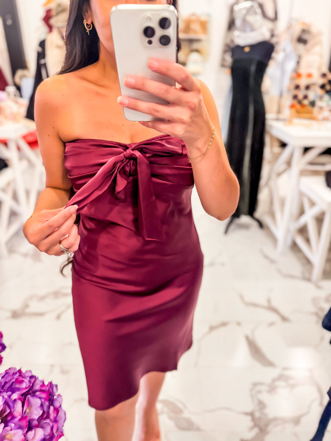 The moment you slip into this dress, you’ll understand why we’re obsessed! The Appreciate You Satin Mini Dress is the definition of flirty elegance, designed in a rich plum satin that catches every bit of light beautifully. The strapless neckline features a statement bow detail that instantly elevates the look, soft, feminine, and effortlessly eye catching without trying too hard. Finished with a clean back and a sleek mini length, it’s the piece you’ll reach for when you want to feel stunning with zero effort. Rovk this mini with our Birch Hollow Cardigan, Nora Ring, and heels.