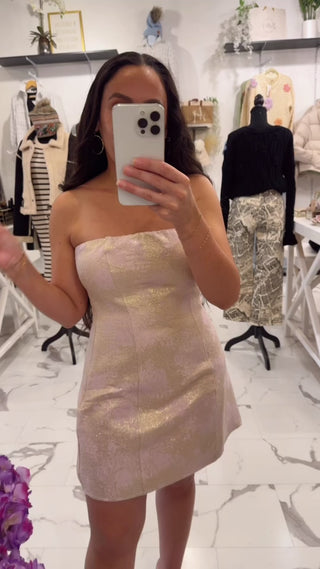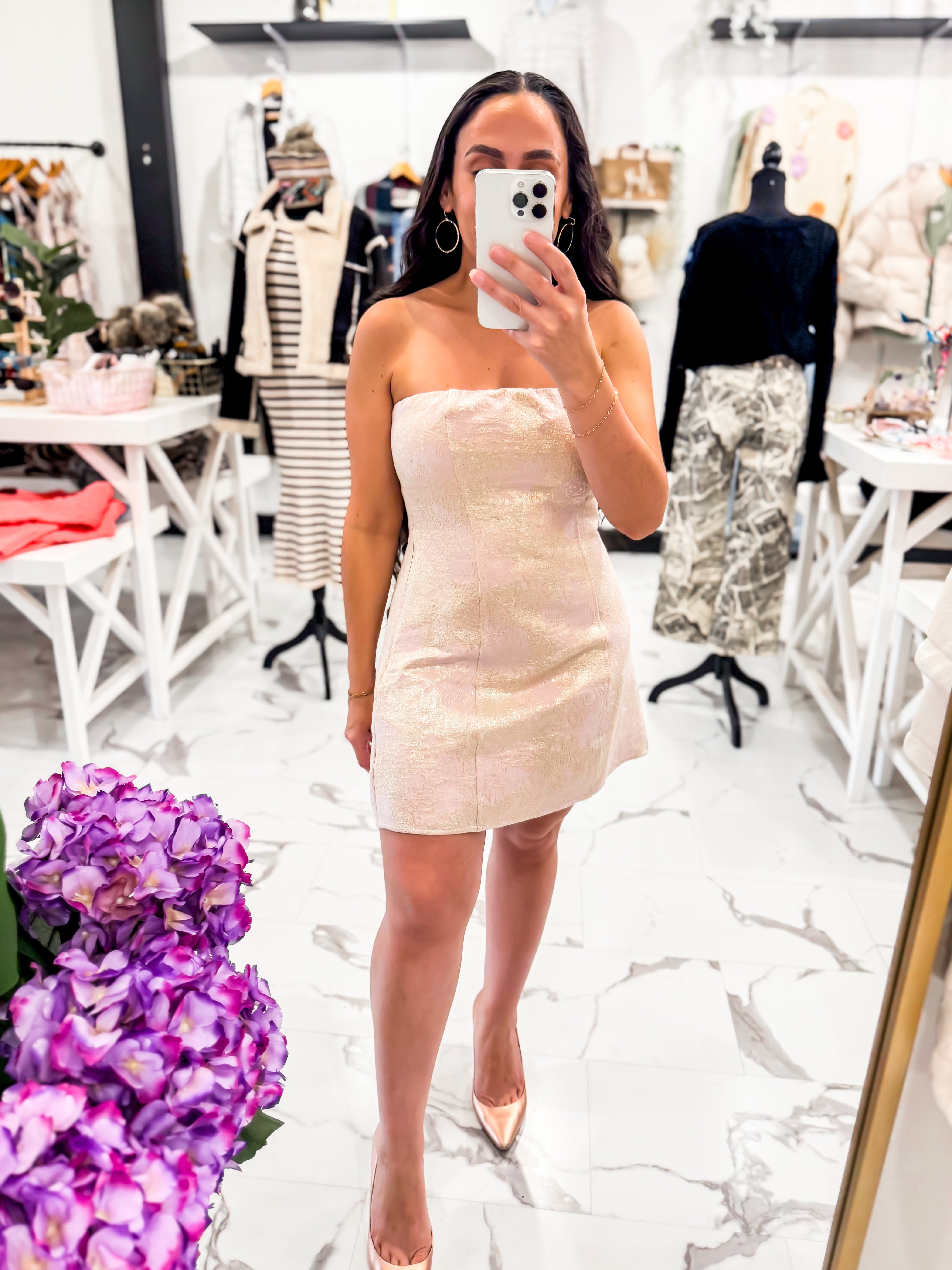 Soft, shimmery, simply stunning! The On My Own Strapless Mini Dress is the definition of quiet glamour. Designed in a romantic dusty pink jacquard with subtle gold threading, it catches the light beautifully with every movement. The clean strapless neckline and tailored silhouette create a timeless, confident fit that flatters your shape while keeping it effortlessly elegant. Rock this dress with our Meghan Earrings, Sunday Stroll Cardigan, and pumps.