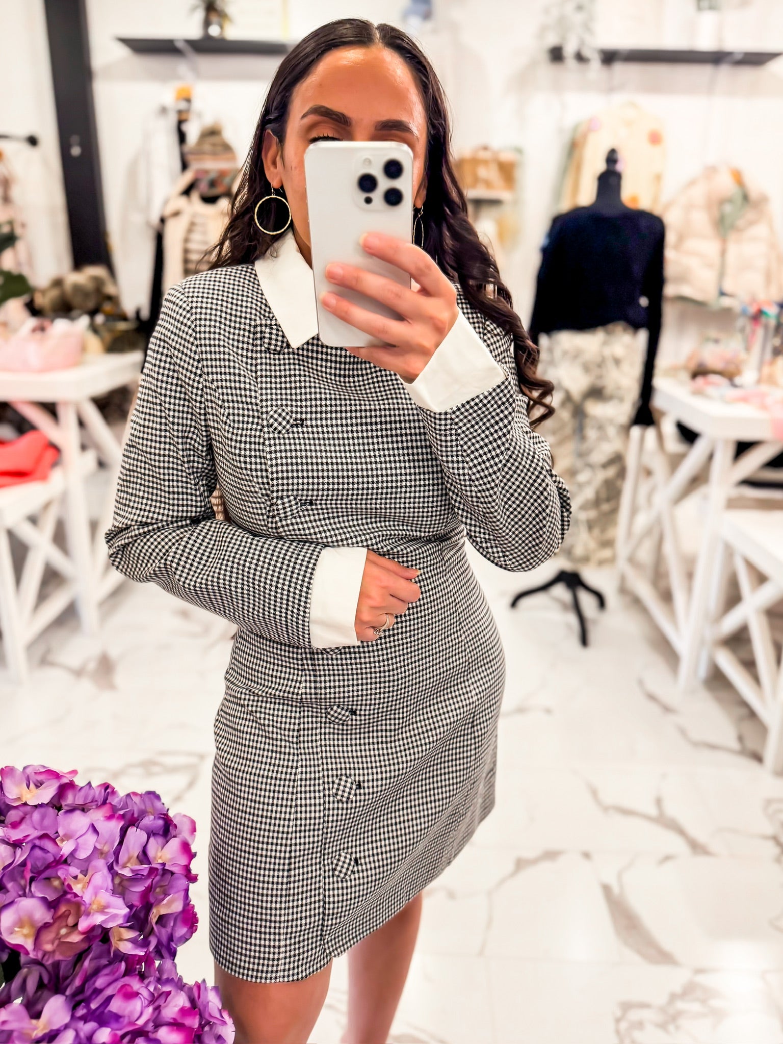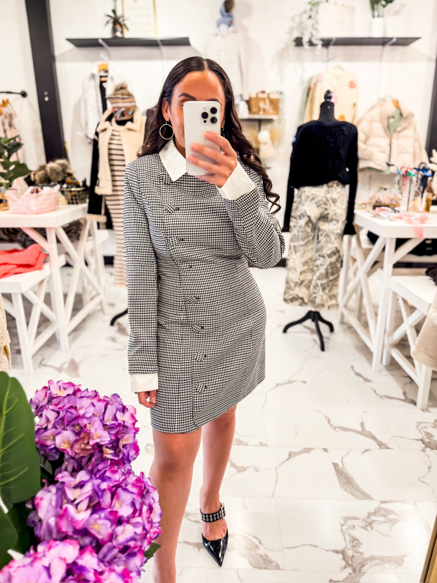 Command attention the moment you walk in! The Running The Show Plaid Mini Dress blends timeless sophistication with a modern, feminine edge. Designed in a chic black and white gingham print, this double breasted silhouette gives major “boss energy” while keeping things playful and polished. The crisp white collar and cuffs bring that preppy touch we love, while the tailored fit flatters your figure in all the right places. Rock this dress with Harlow Ring, Leila Earrings, tights, and pumps.