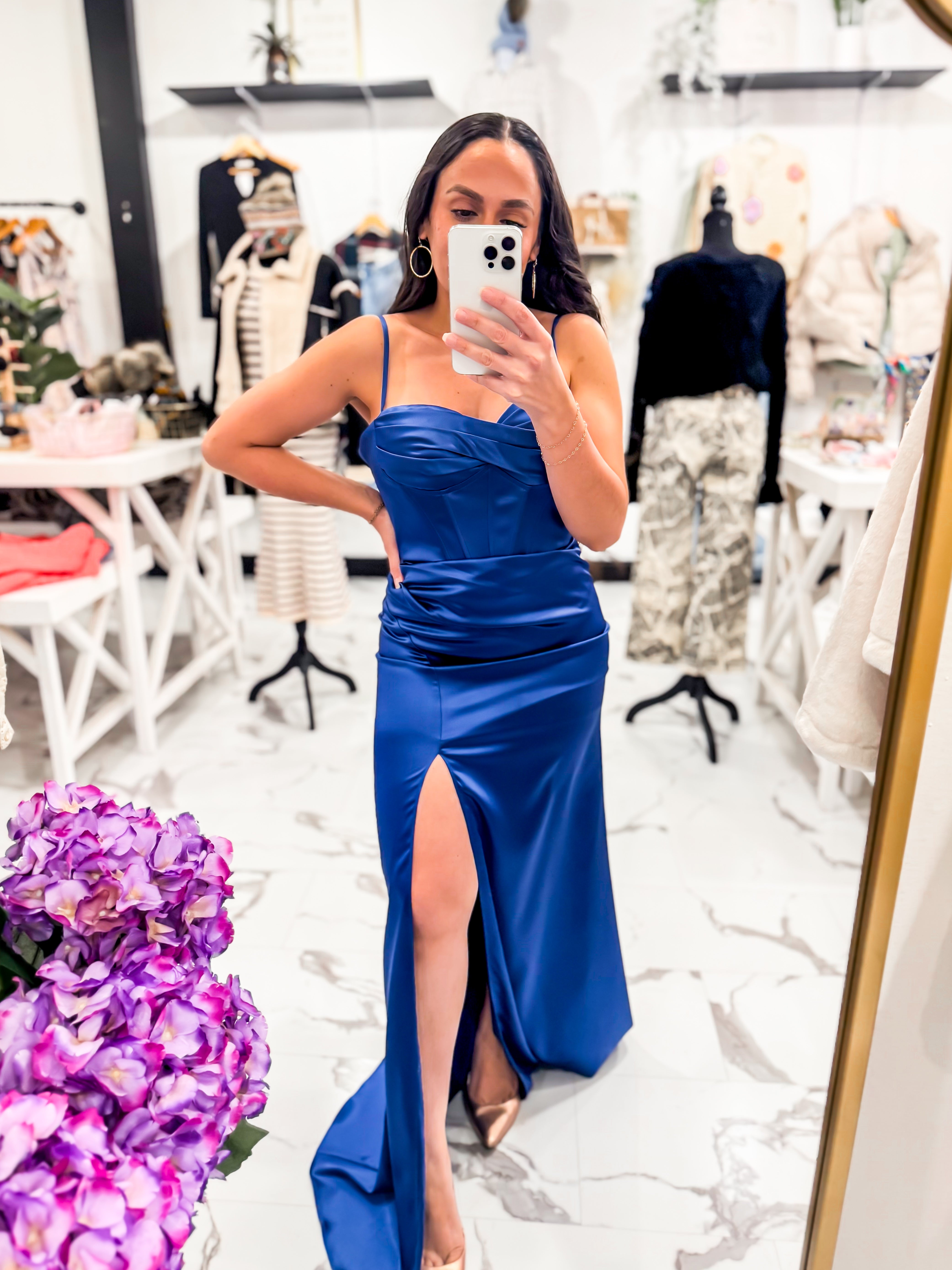 When the lights hit, all eyes are on you! The Steal the Spotlight Dress is made for your unforgettable moments. Crafted from soft navy satin that glows with every step. The structured bodice sculpts your shape while delicate pleating and a leg baring slit add an effortlessly confident finish. Designed to hug in all the right places, this dress is the definition of modern glamour. Pair this dress with our Nora Ring, Casey Earrings, and heels.