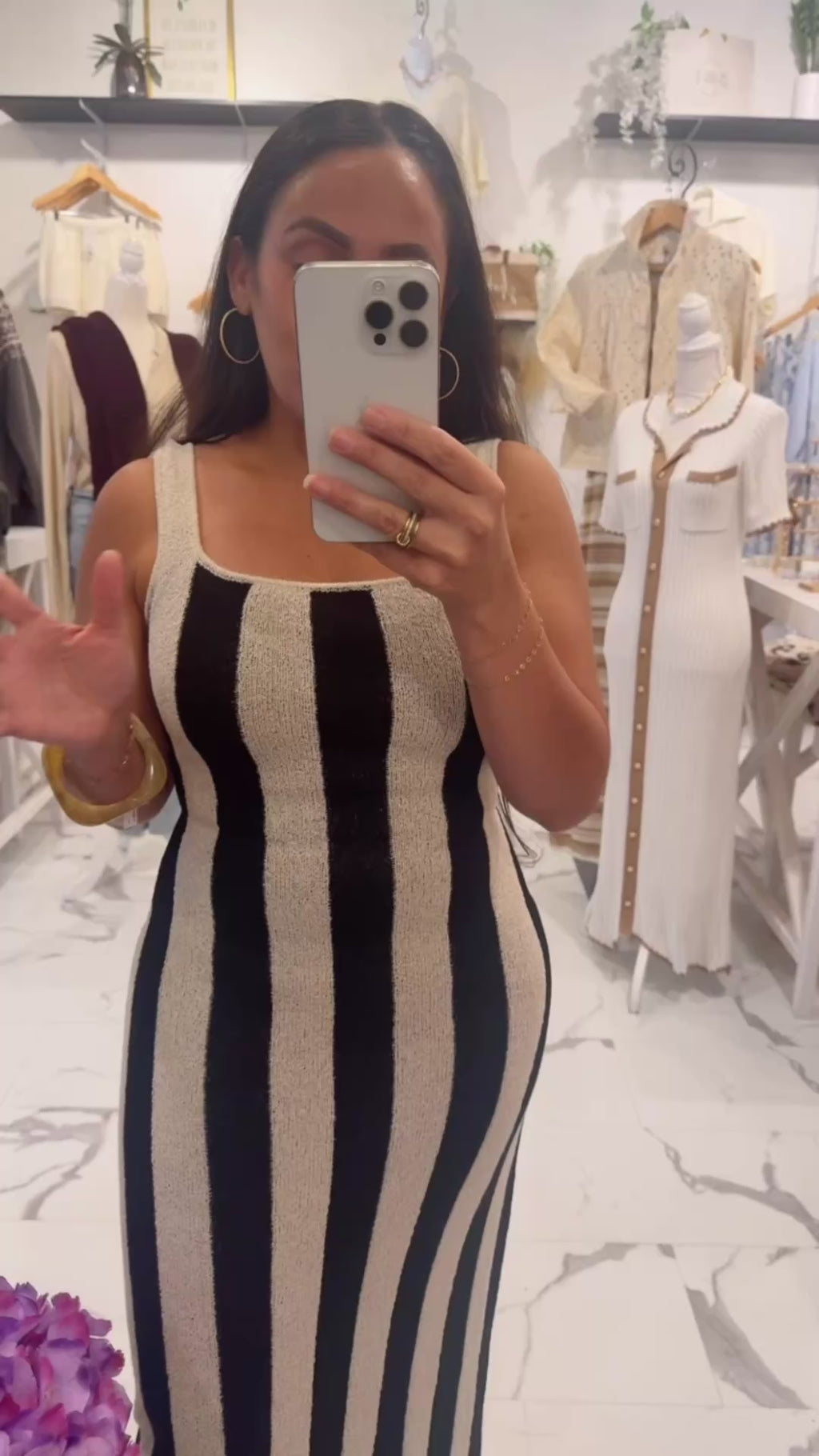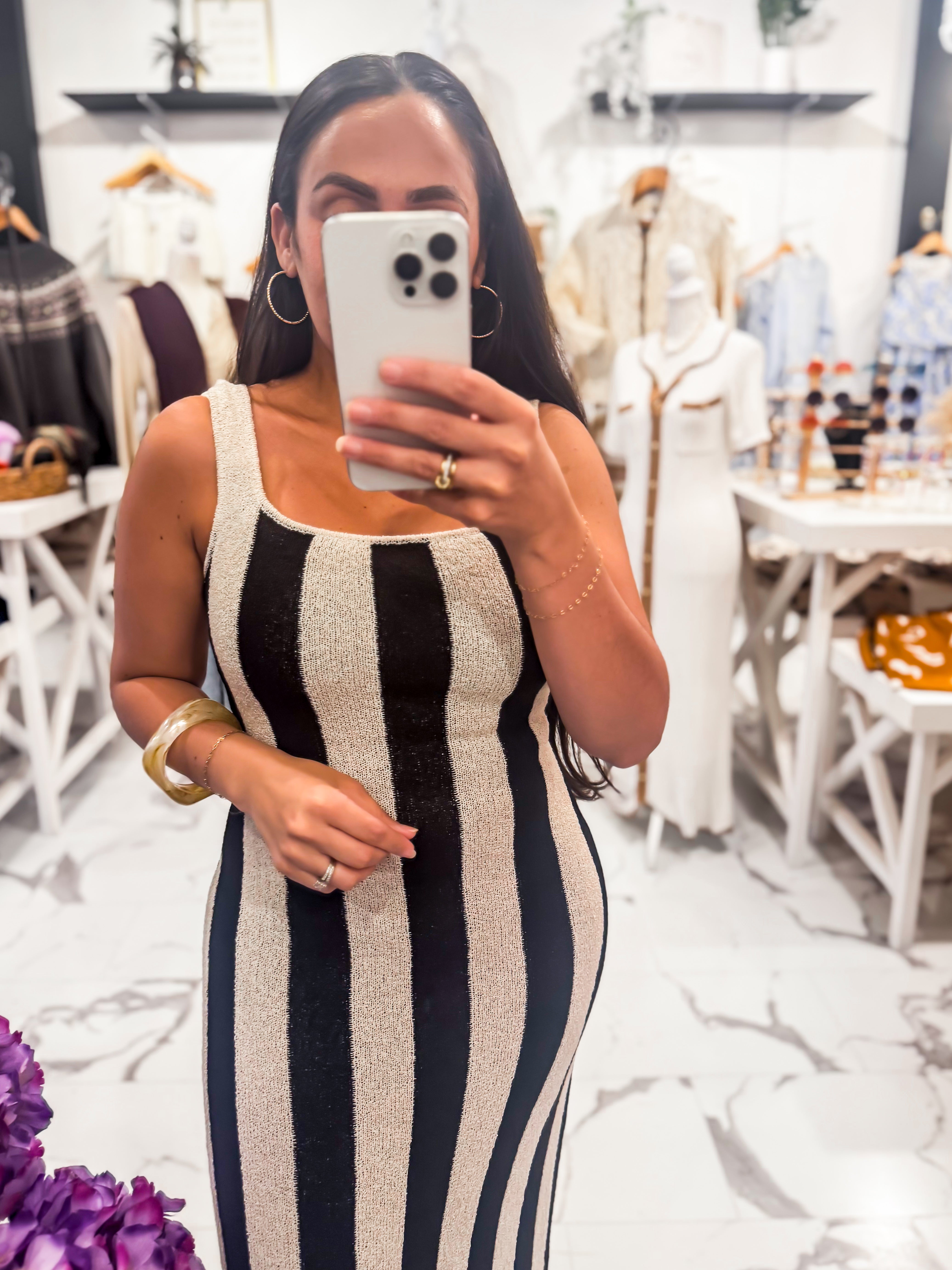 The Straightforward Stripe Maxi Dress creates a sleek, flattering look while keeping things comfortable and effortless. Designed in a soft knit fabric with bold vertical stripes, this maxi dress creates a sleek silhouette that hugs in all the right places while still feeling comfortable enough for all day wear. The oatmeal and black stripe pattern gives this dress a timeless, elevated feel while the sleeveless neckline keeps the look fresh and modern. Pair this dress with our Layla Earrings, Camila Bangle, and sandals.