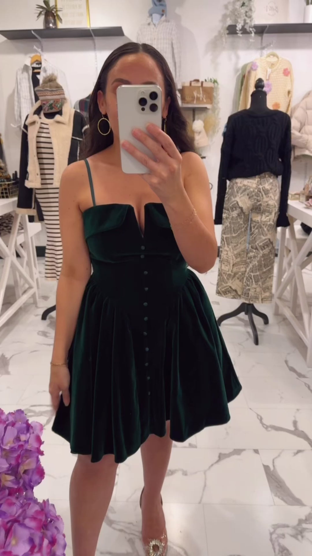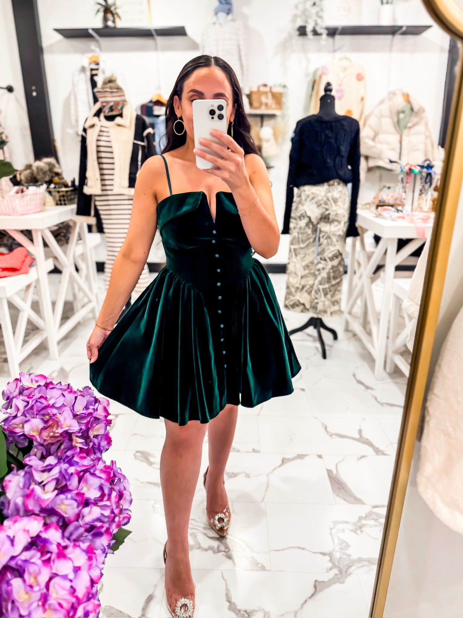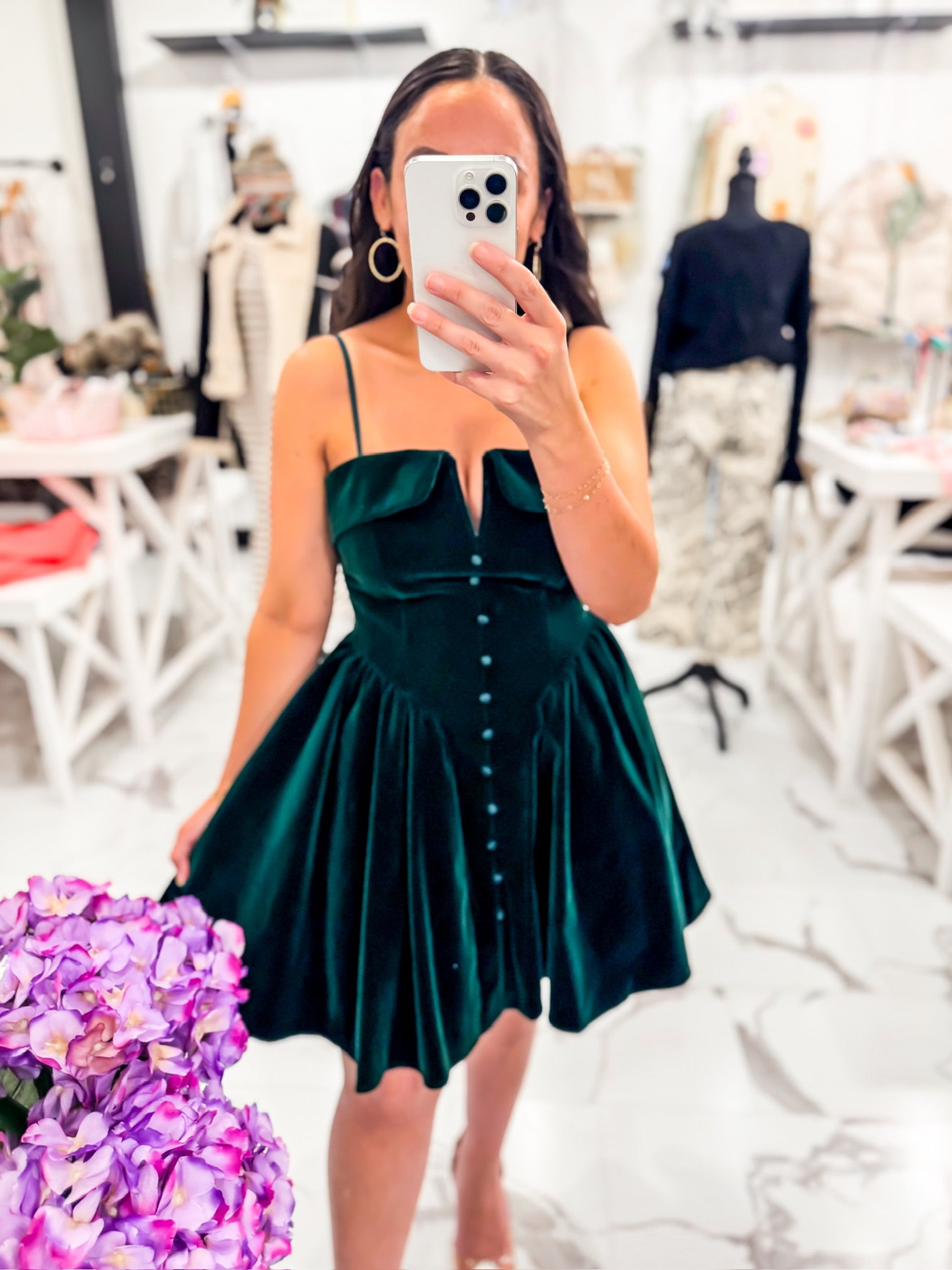 Meet the dress that brings the energy! The Terra Tone Velvet Mini Dress brings luxe texture and romantic drama together in one statement silhouette. Crafted from a rich hunter green velvet that shimmers softly under the light, this mini features a structured bust with a subtle notched neckline, dainty spaghetti straps, and covered button detailing down the front for a touch of vintage charm. The flared skirt moves beautifully with your every step. Pair this dress with our Mona Ring, Amanda Earrings, and pumps.