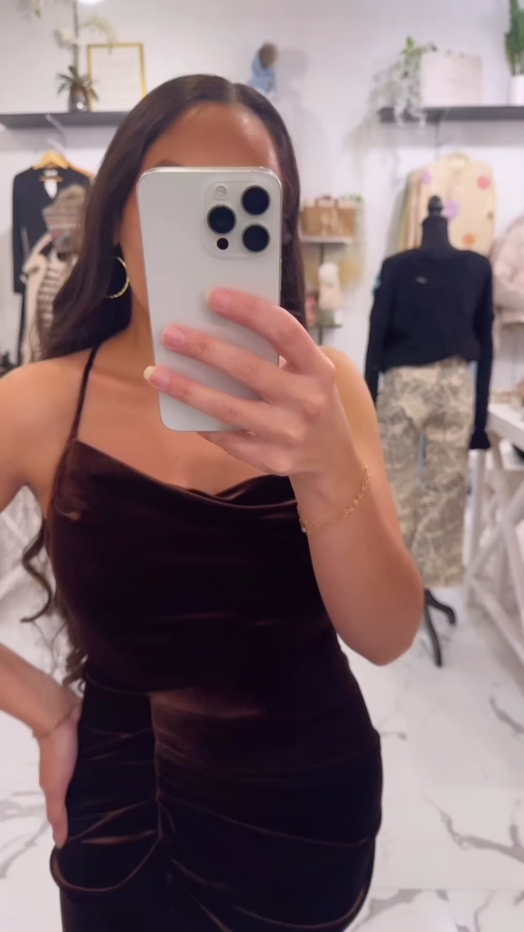 All eyes on you, babe! The The Afterglow Velvet Mini Dress is where timeless elegance meets sultry sophistication. Crafted from soft, luxurious velvet in a deep bronze hue. This dress was made to flatter with its body hugging silhouette, draped neckline, and perfectly placed ruching that enhances every curve. The asymmetric slit adds just the right touch of drama. Pair this dress with our Timberline Jacket, Bell Ring, tights, and boots.