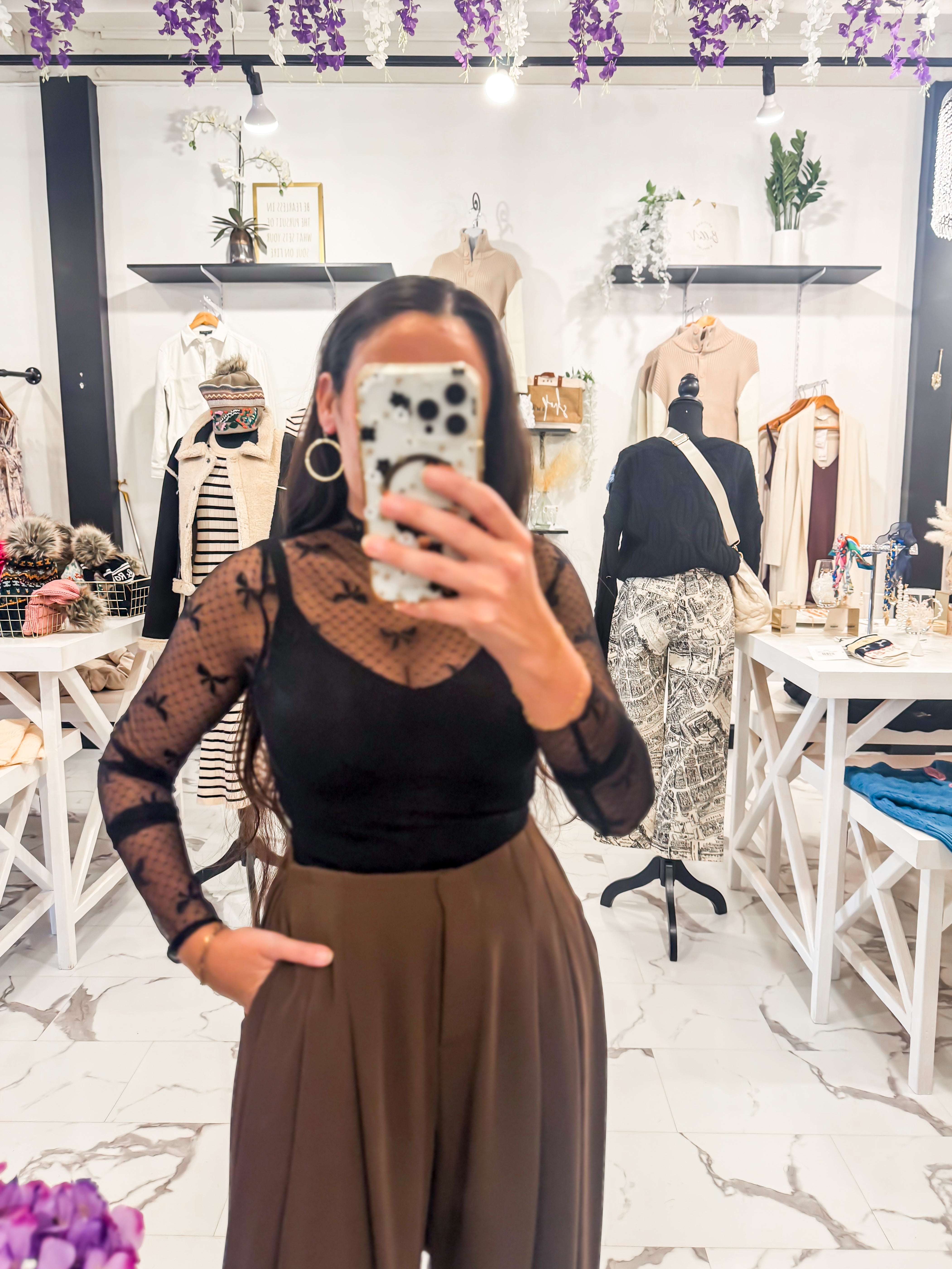 Flirty meets sophisticated in the Heart On The Line Knit Top! This sheer black knit is covered in delicate embroidered bows that make the perfect feminine statement while keeping things subtly sultry. The fitted silhouette and mock neckline make it the ideal layering piece. Pair it with your favorite bralette or cami for a romantic yet elevated look that transitions seamlessly from day to night. Rock this layer style with our Way Too Good Set, Angela Ring, and boots.