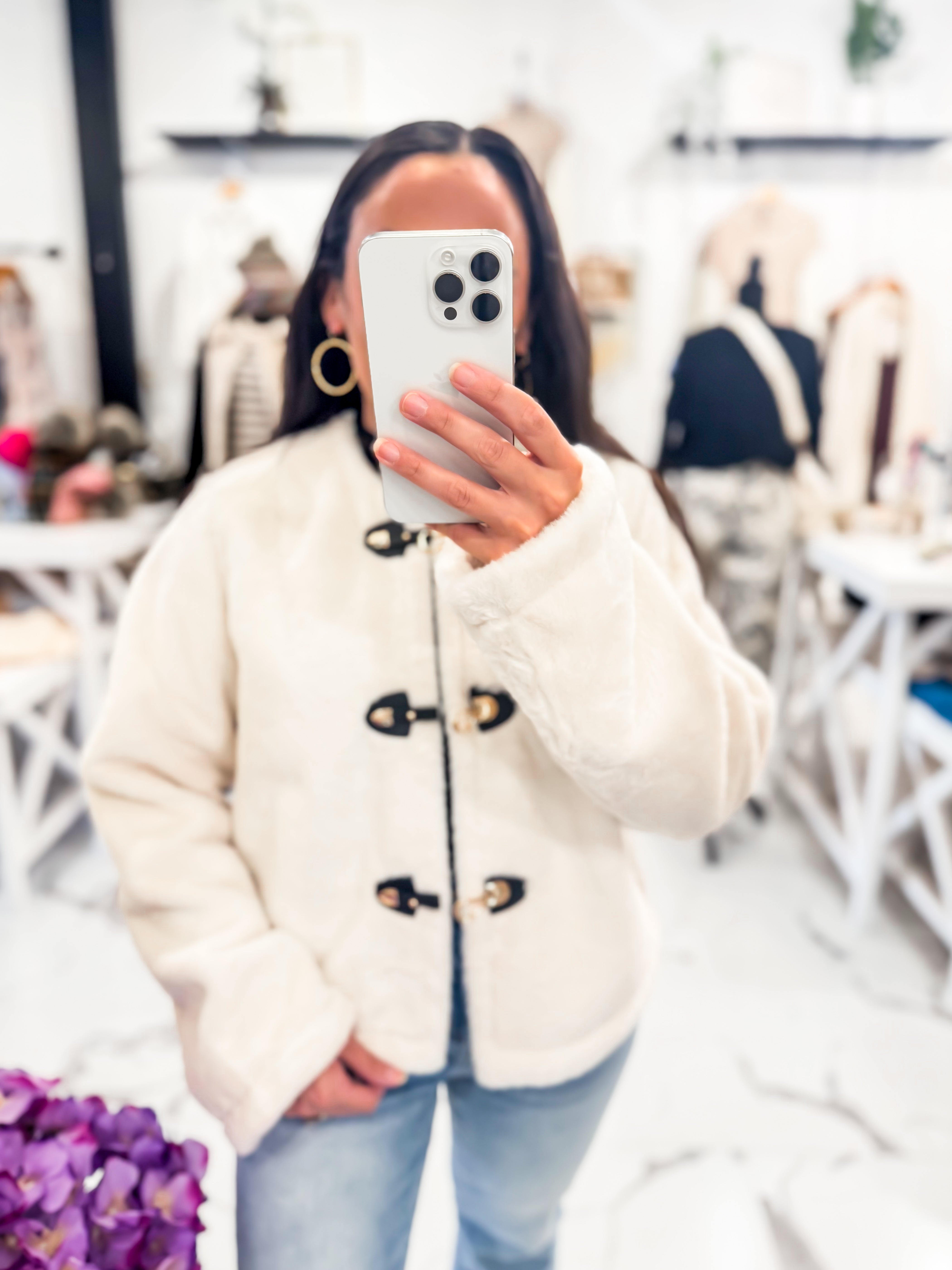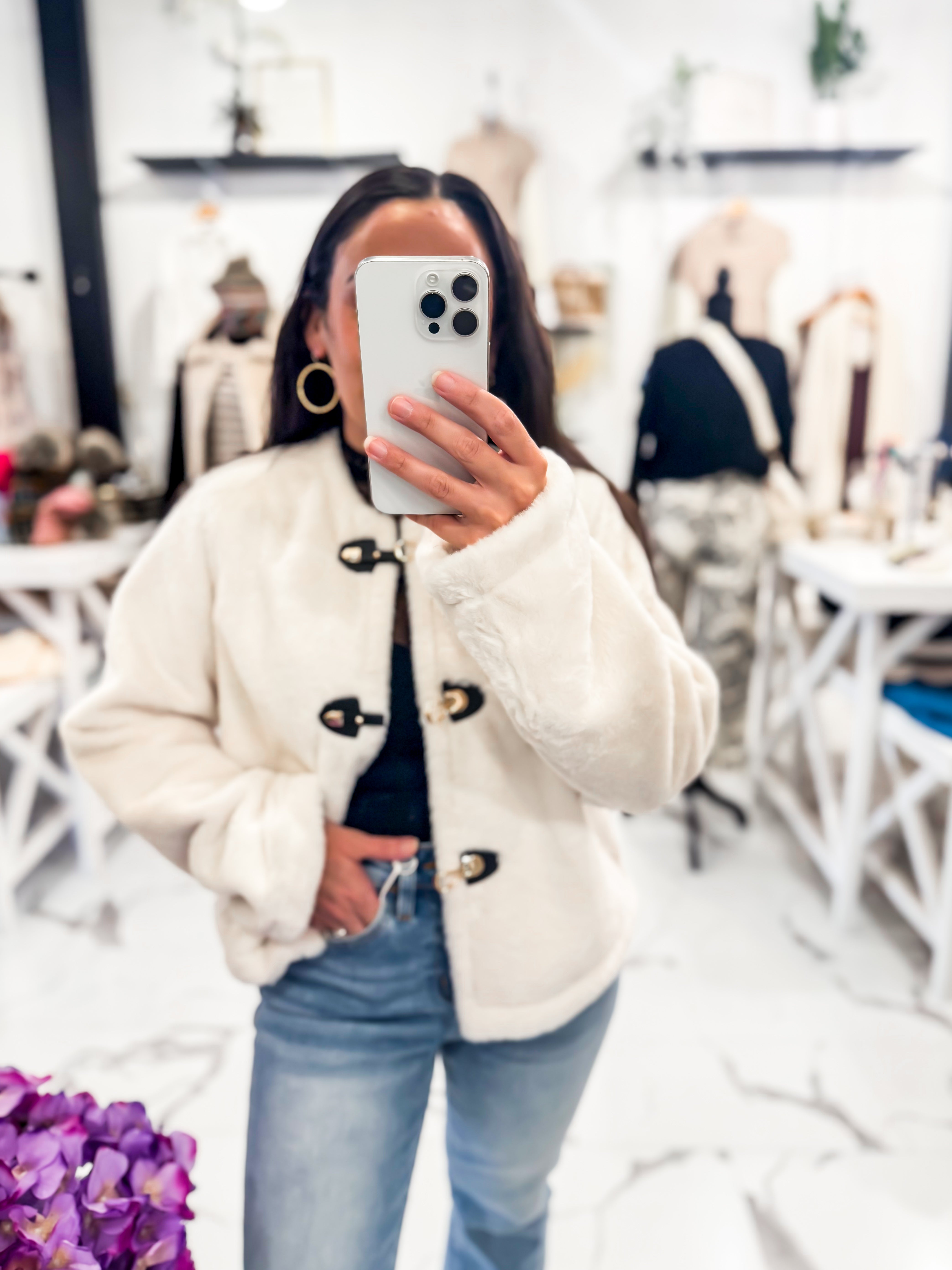Cozy, chic, and oh so adorable! Our Adore Me Faux Fur Jacket is the ultimate statement layer for the season. Designed in a soft cream hue with luxe gold accented toggle closures, this jacket blends timeless sophistication with modern edge. Fully lined for warmth and comfort, it’s the piece you’ll reach for on repeat. Rock her with our Burnt Sienna Ruffle Dress, 1863 Club Earrings, and tall boots.