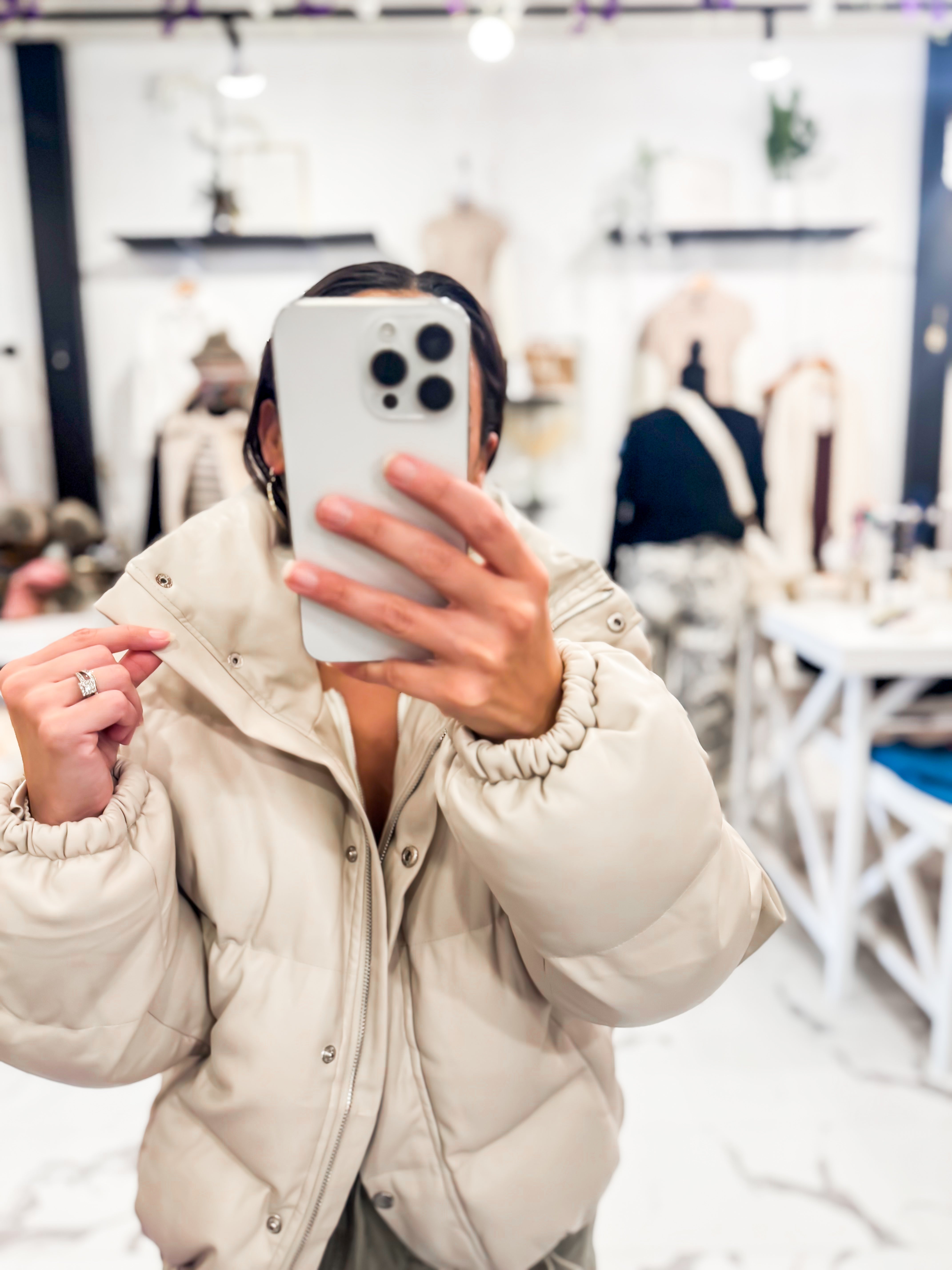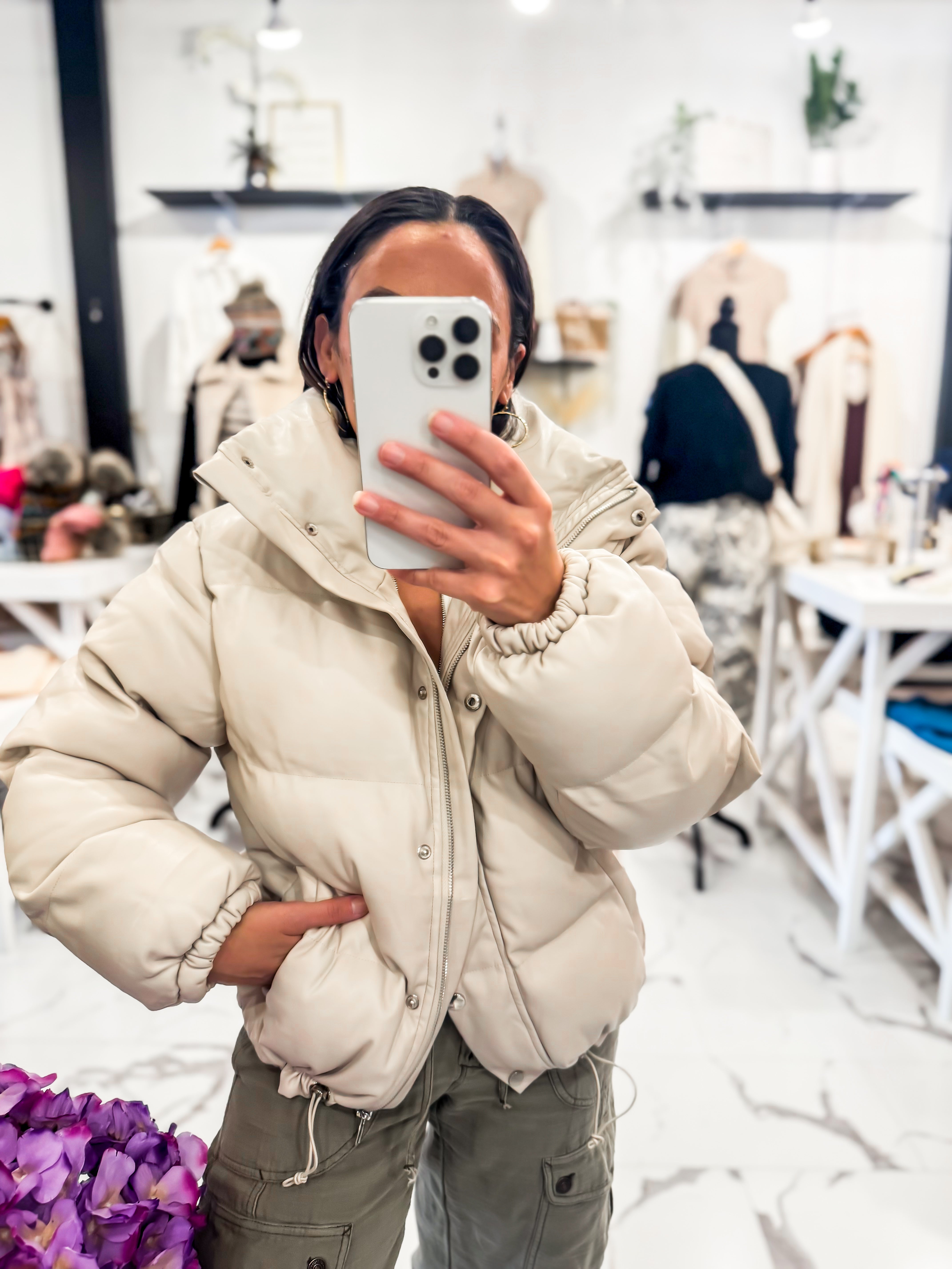 A winter essential that knows how to make an entrance, meet the Aspen Faux Leather Puffer. Combining sleek sophistication with cozy practicality, this jacket brings that luxe, city meets chalet vibe we love. The buttery soft faux leather finish and matte stone hue give it a modern, elevated twist on a classic puffer. With a zip and snap front closure, elastic cuffs, and adjustable drawstring hem, it’s built for warmth without sacrificing style. Pair this puffer with our Appalachia Beanie, Weekend Escape Jeans, and sneakers.