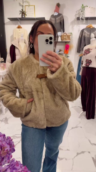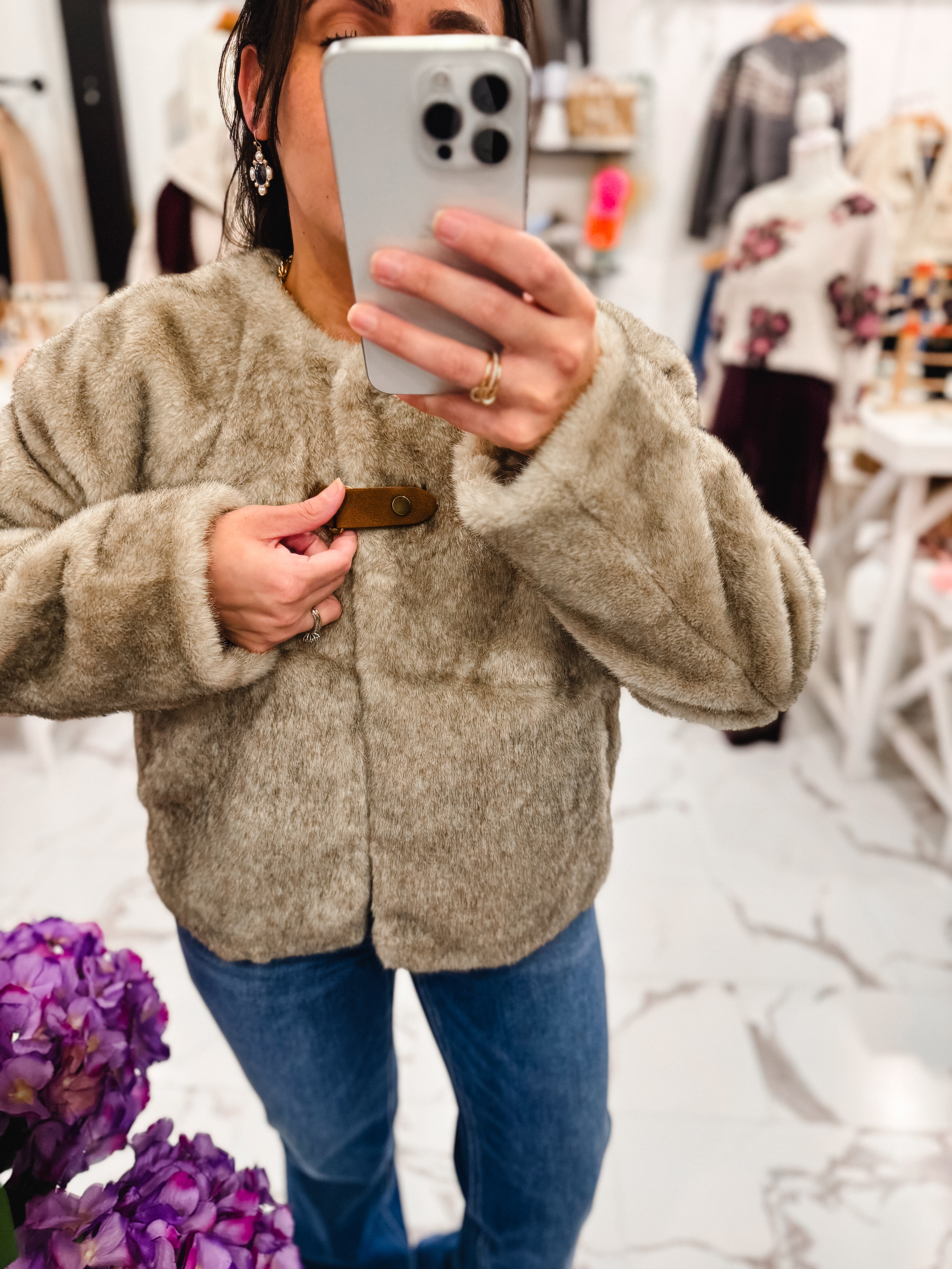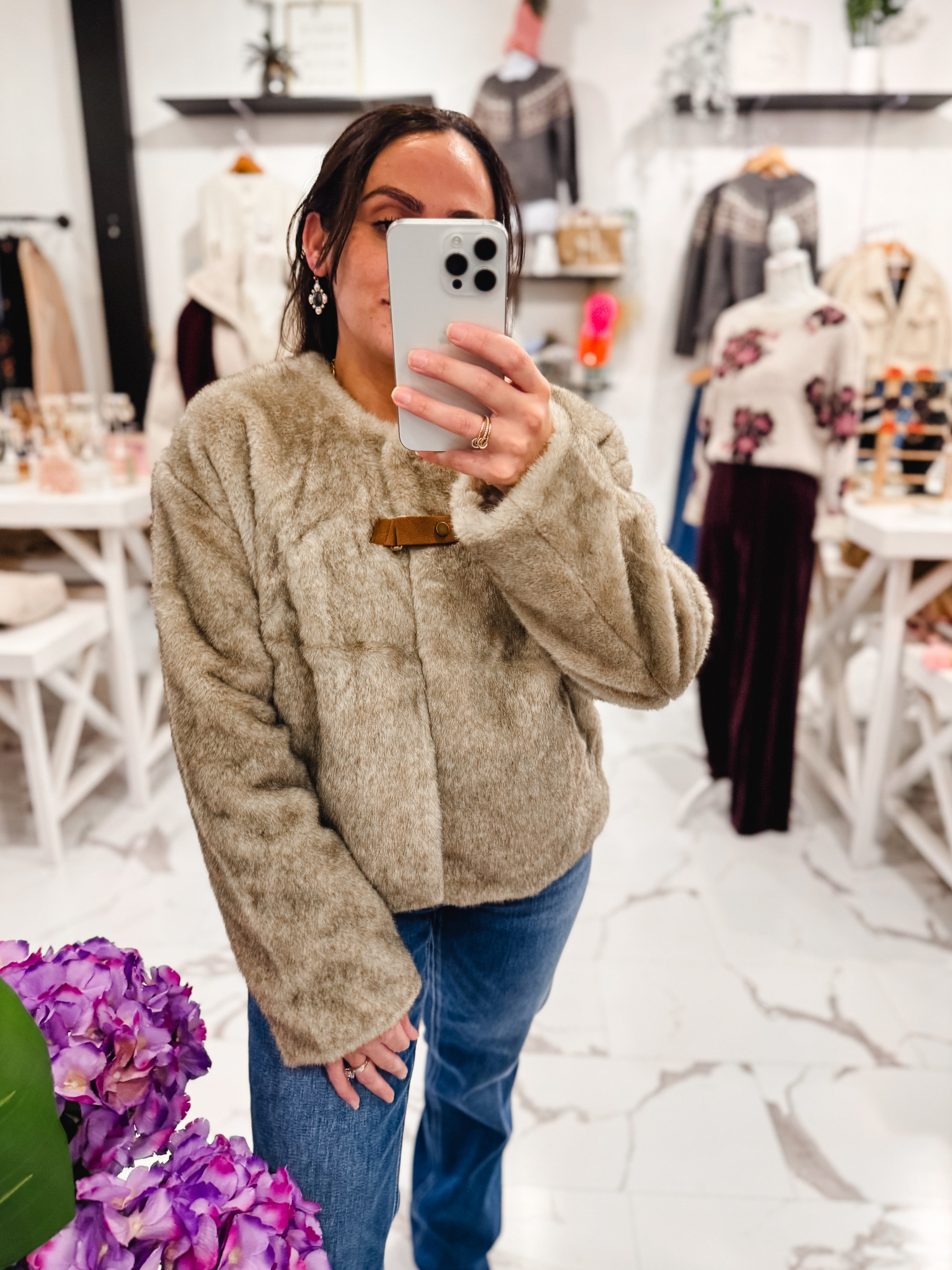 This ultra soft faux fur jacket is the definition of effortless cozy! Designed with a relaxed silhouette and a smooth, lightweight feel, it adds instant warmth without feeling bulky. The neutral light taupe shade makes it endlessly versatile, while the subtle front closure detail gives it a refined finish. Easy to throw on over denim and knits or dress up with tailored pieces. This jacket is one you’ll reach for again and again from everyday errands to casual nights out. Rock this jacket with our Softer Love Top, Solstice Pants, and heels.