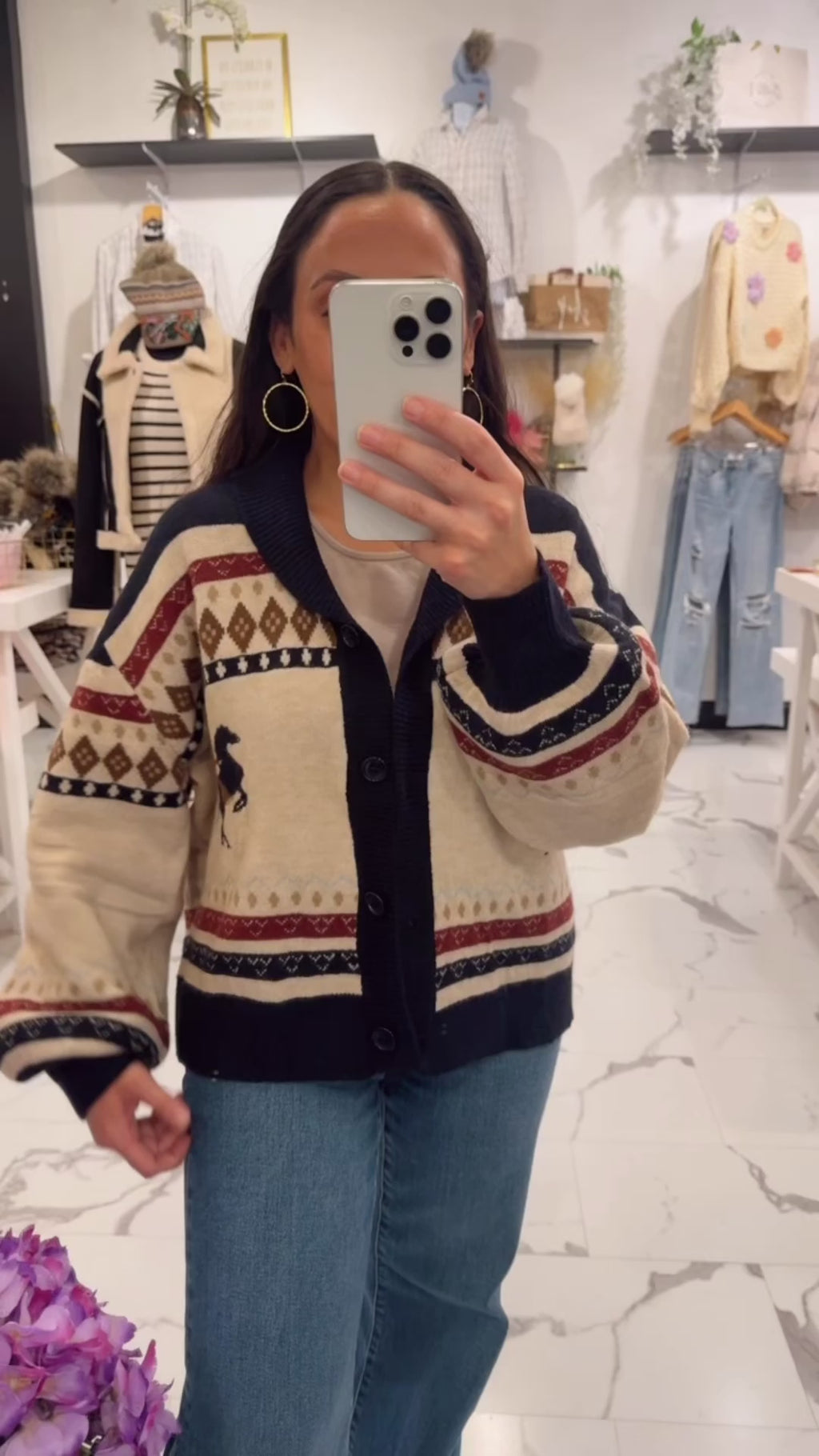 Western charm meets cozy sophistication. The Ranch Romance Knit Cardigan brings effortless style to your cold weather lineup with its soft knit feel and equestrian inspired pattern. Designed with rich navy, chocolate, and burgundy tones against a warm cream base, it’s the perfect blend of rustic and refined. The relaxed fit layers beautifully over a basic tee, button down, or mock neck, while the bold fair isle motif and horse detail add a playful touch of personality. Style it with our Dreaming of You Denim, All She Is Top, 1863 Club Earrings, and booties.