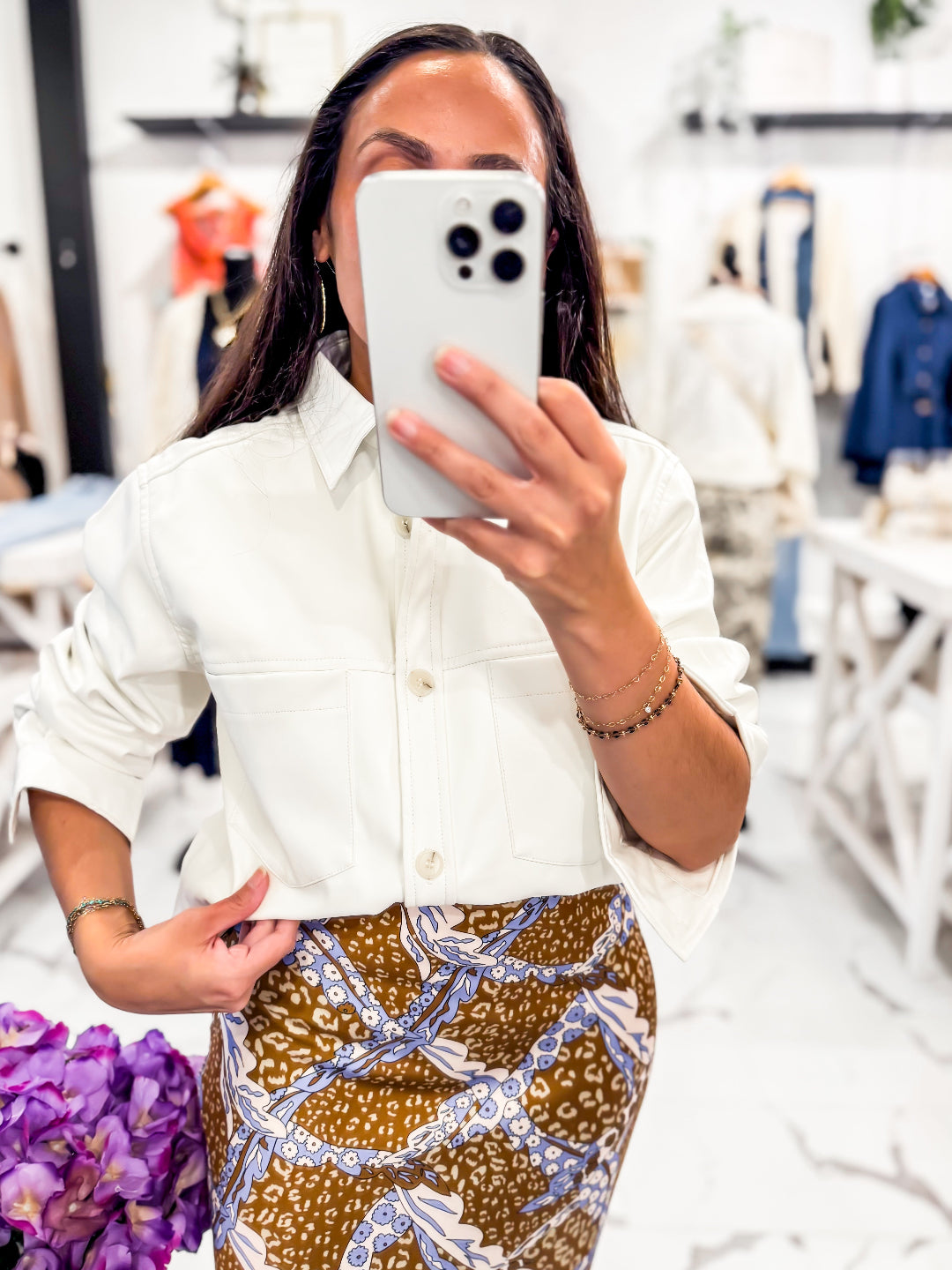 Polished, versatile, and oh so chic! Our Sleek Intentions Vegan Shacket is the piece that does it all. Crafted in a sleek vegan leather finish with a crisp white hue, it features a structured collared neckline, button down front, and chest pocket details for that effortlessly cool vibe. Can be worn as a top or layering piece. Rock it with our Wild At Heart Skirt, 1863 Club Earrings, and tall boots.
