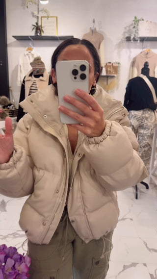 A winter essential that knows how to make an entrance, meet the Aspen Faux Leather Puffer. Combining sleek sophistication with cozy practicality, this jacket brings that luxe, city meets chalet vibe we love. The buttery soft faux leather finish and matte stone hue give it a modern, elevated twist on a classic puffer. With a zip and snap front closure, elastic cuffs, and adjustable drawstring hem, it’s built for warmth without sacrificing style. Pair this puffer with our Appalachia Beanie, Weekend Escape Jeans, and sneakers.