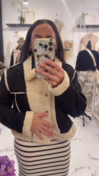 When cozy meets chic, say hello to the Timberline Sherpa Jacket! This plush statement layer brings a touch of mountain charm to city streets with its black faux suede exterior and contrasting cream sherpa lining. Designed for warmth and attitude, it features an oversized collar, exposed seam details, and a relaxed boxy fit. Rock this jacket with our Weekend Escape Jeans, All She Is Top, Pretty Simple Beanie, and sneakers.