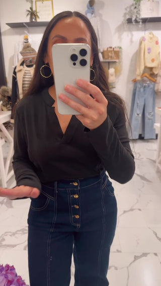 Meet the sleek and effortless top that makes every outfit feel instantly elevated! The All She Is Long Sleeve Top features a soft, silky feel fabric with a subtle sheen that drapes beautifully and moves with you. The clean notched neckline adds a modern touch, while the long sleeves give you that refined, put together look you can wear anywhere. Designed to be tucked, styled, or layered, this top is the definition of versatile. Rock this staple with our Highland Plaid Midi Skirt, Angela Ring, and tall boots.