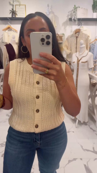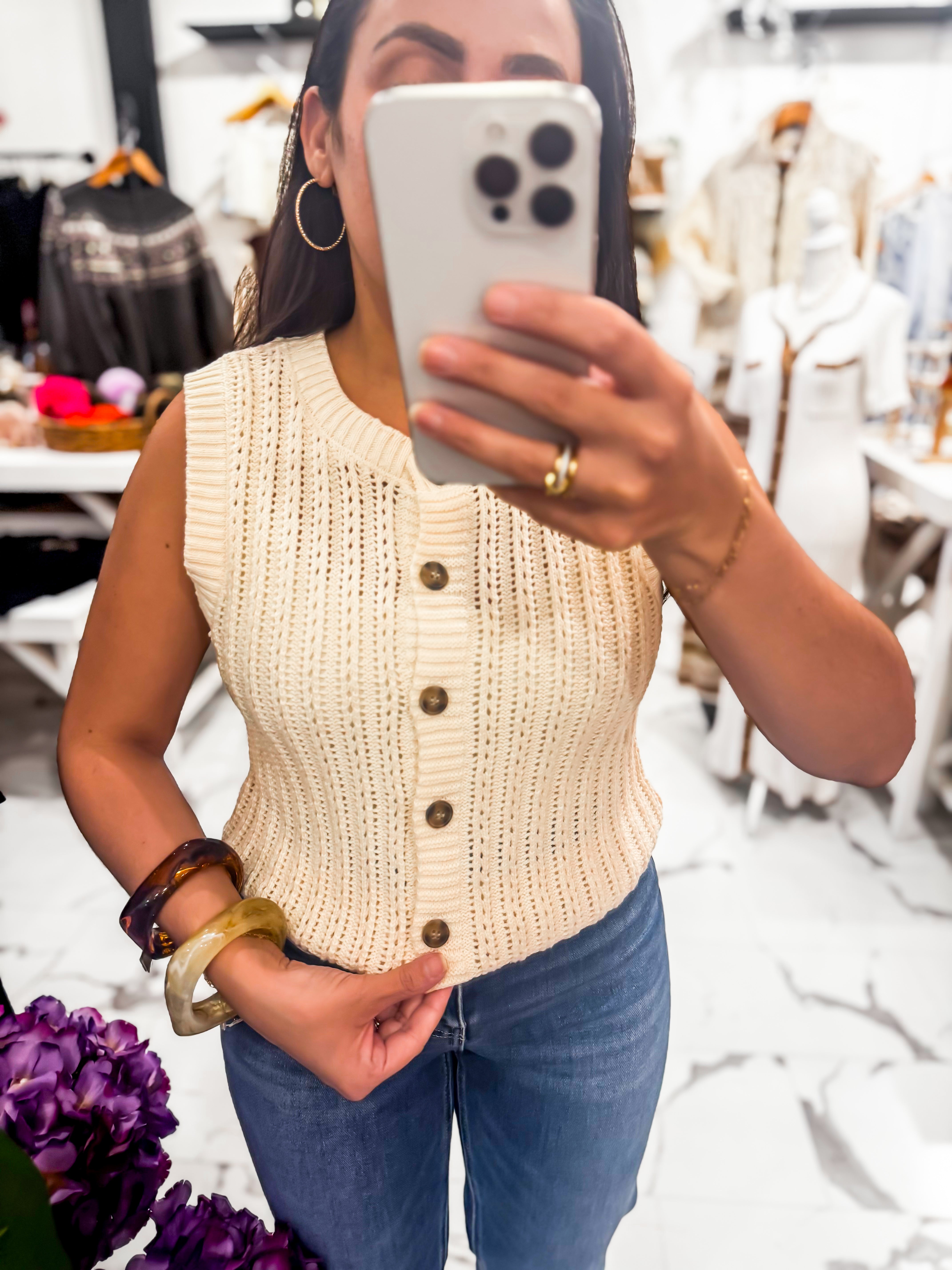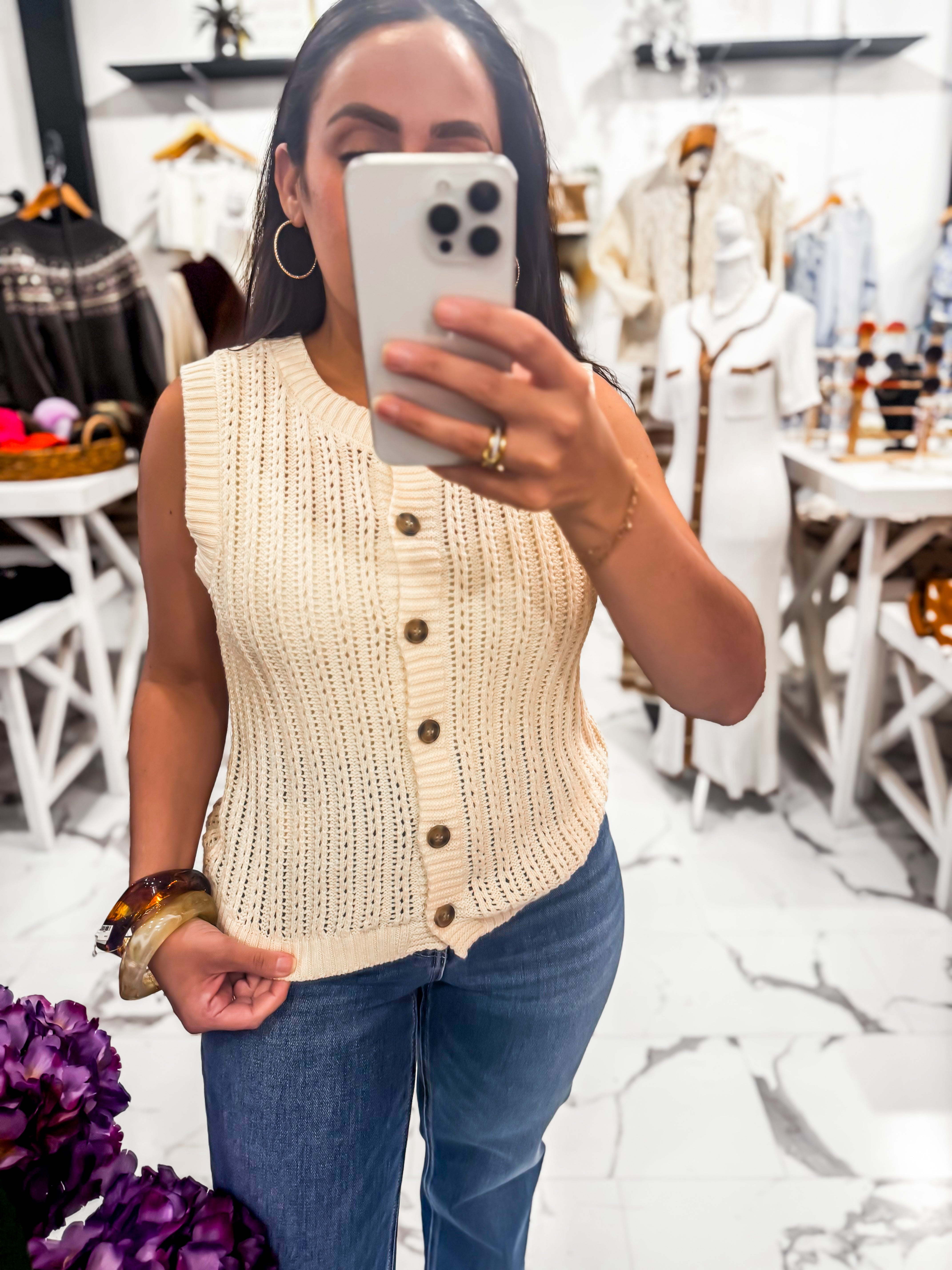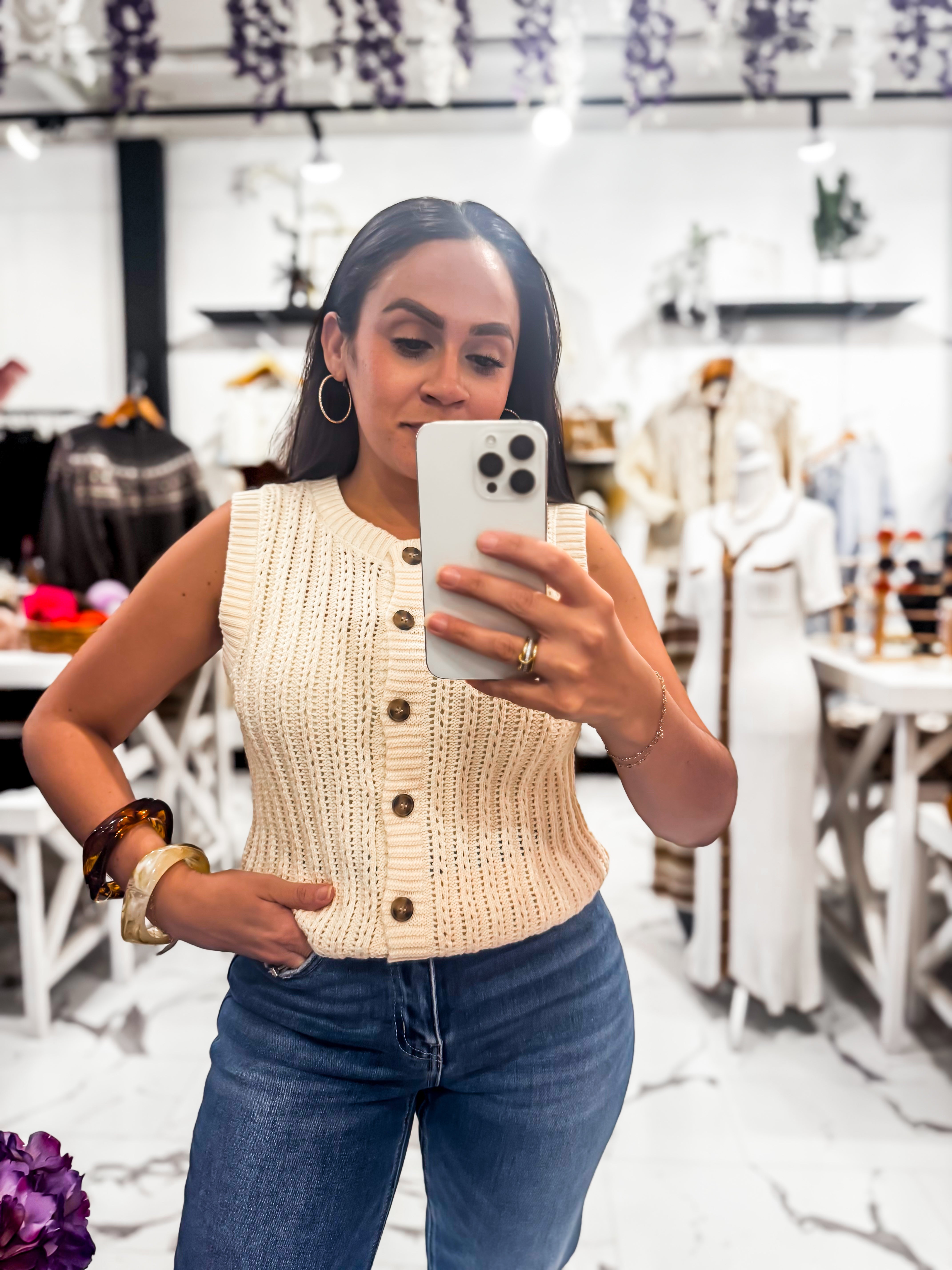 The Better Than Basics Knit Vest is one of those effortless pieces that instantly pulls an outfit together. Designed in a soft oatmeal knit with a flattering sleeveless silhouette, this piece features a textured crochet style knit and classic button front detail that adds just the right amount of charm. The neutral tone makes it endlessly versatile! Pair it with our Zero Effort Jeans, Maya Bracelet, Belle Ring, and wedges.