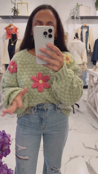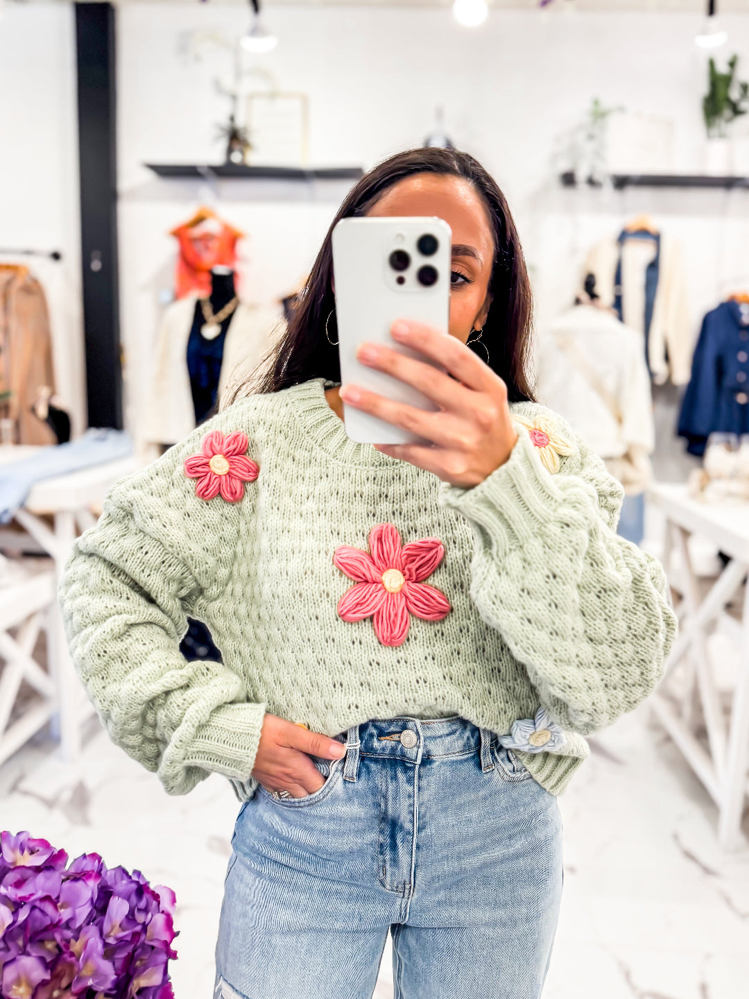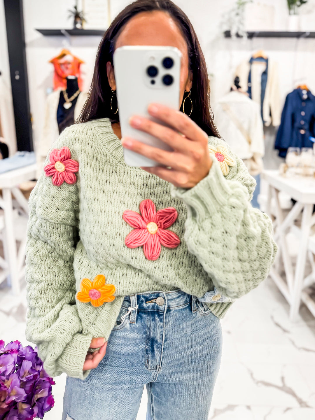 Our Estella Sweater is a staff fav we know you will obsessed with! Features a multi color embroidery flower detail on the perfect sage green background.  Fashioned with a round neckline, cable knit, and drop shoulders. Rock this sweater with our Weekend Escape Jeans, Meghan Earrings, and booties.