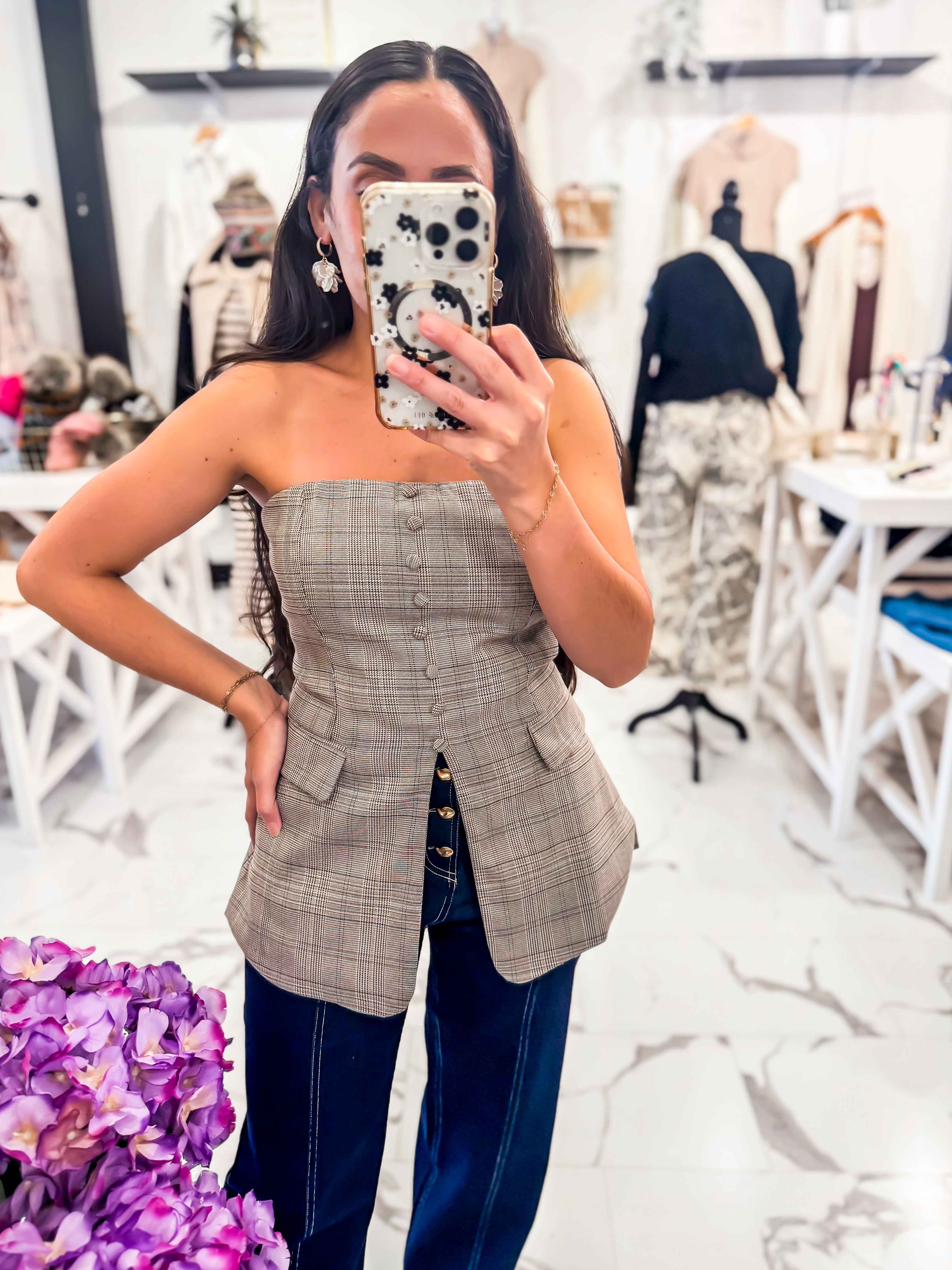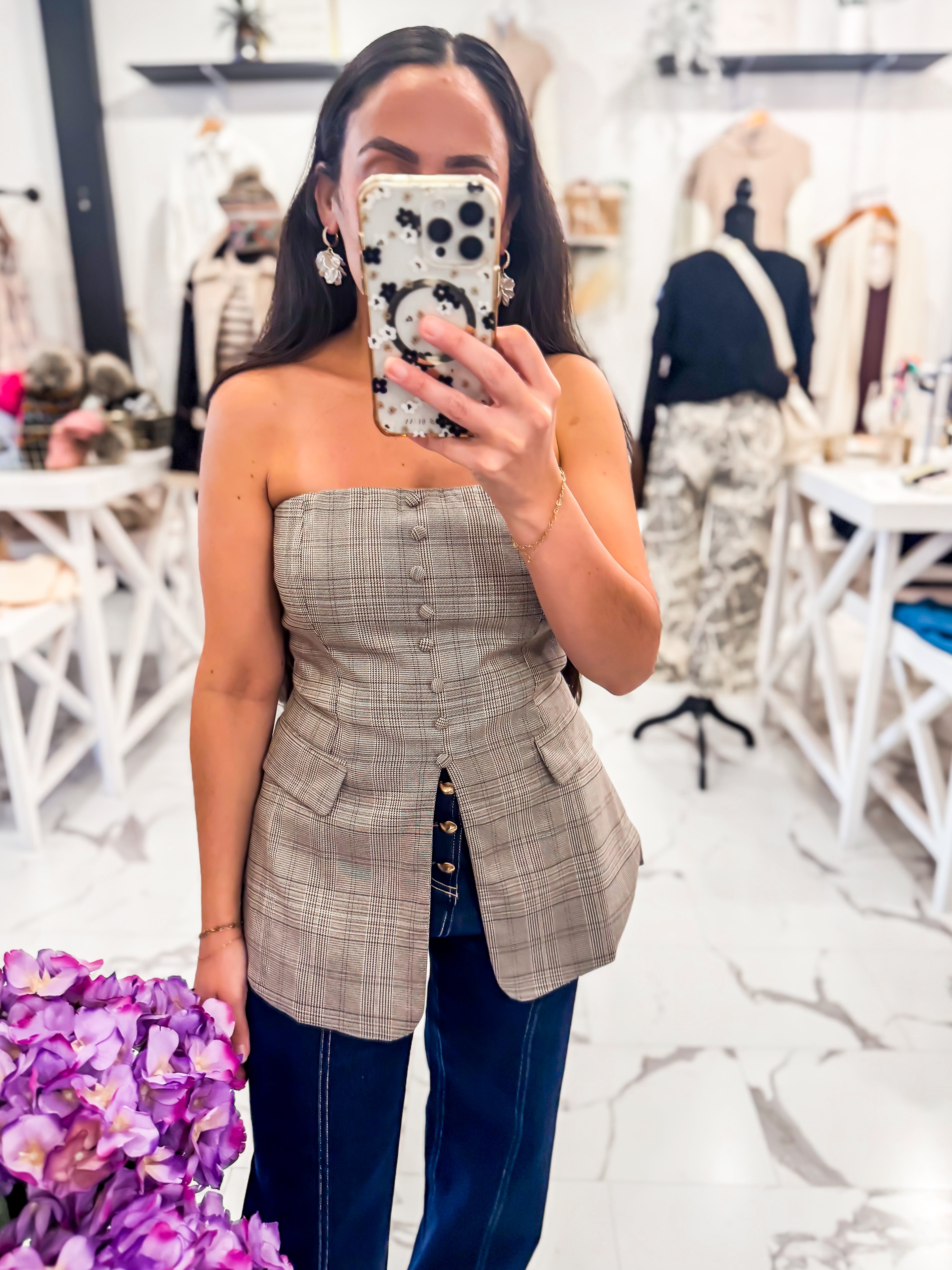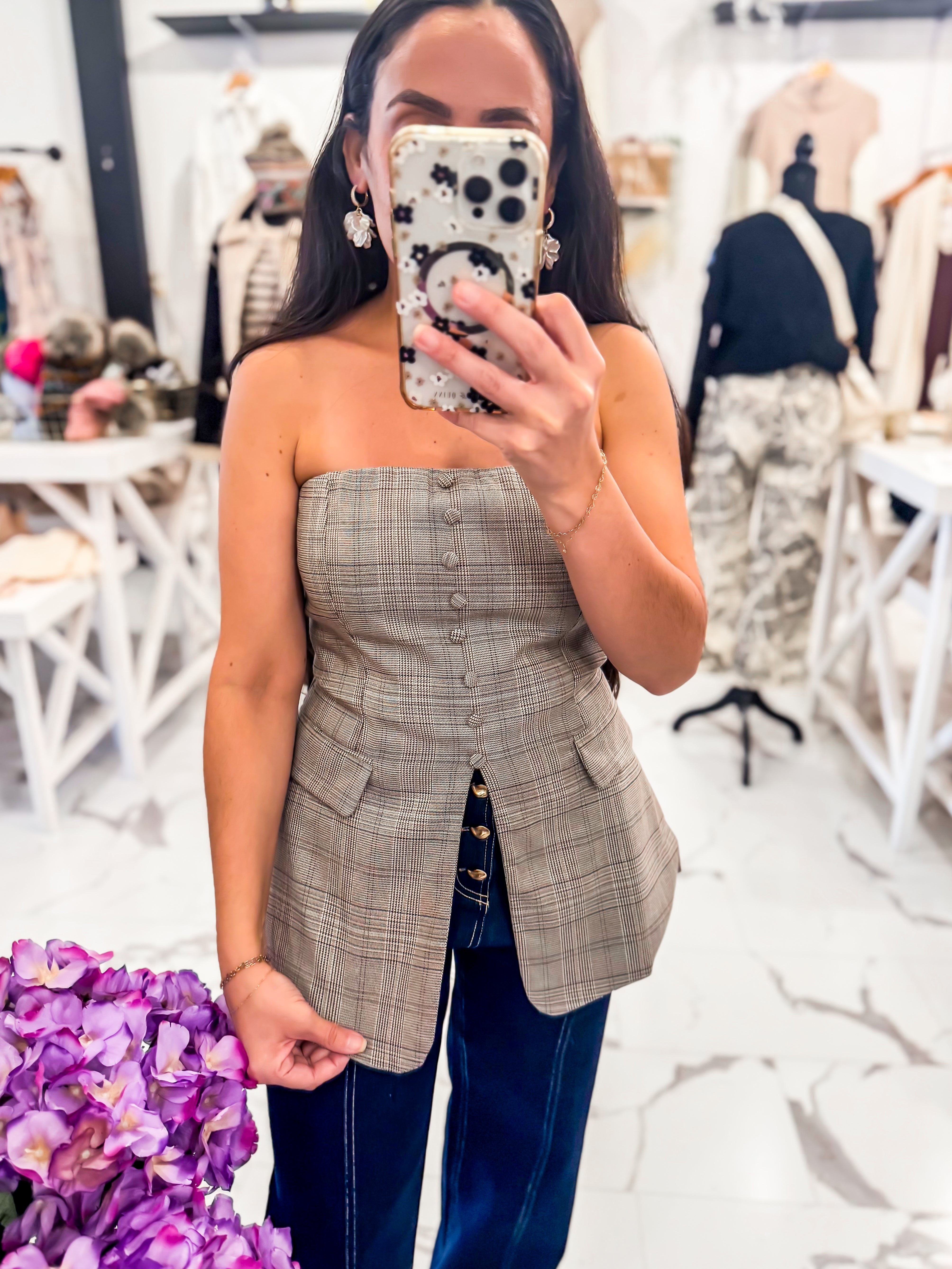 Classic tailoring meets modern femininity! The Highline Strapless Plaid Top is designed with sleek structure and timeless plaid detailing, creating a refined silhouette that still feels effortlessly cool. Featuring a faux buttons with subtle pleating and front flap pockets. This top cinches perfectly at the waist before flowing into a flattering, slightly flared hem. The strapless cut keeps it sophisticated yet playful. Pair it with our Dreaming Of You Pants, Ada Ring, Sloane Earrings, and pumps.