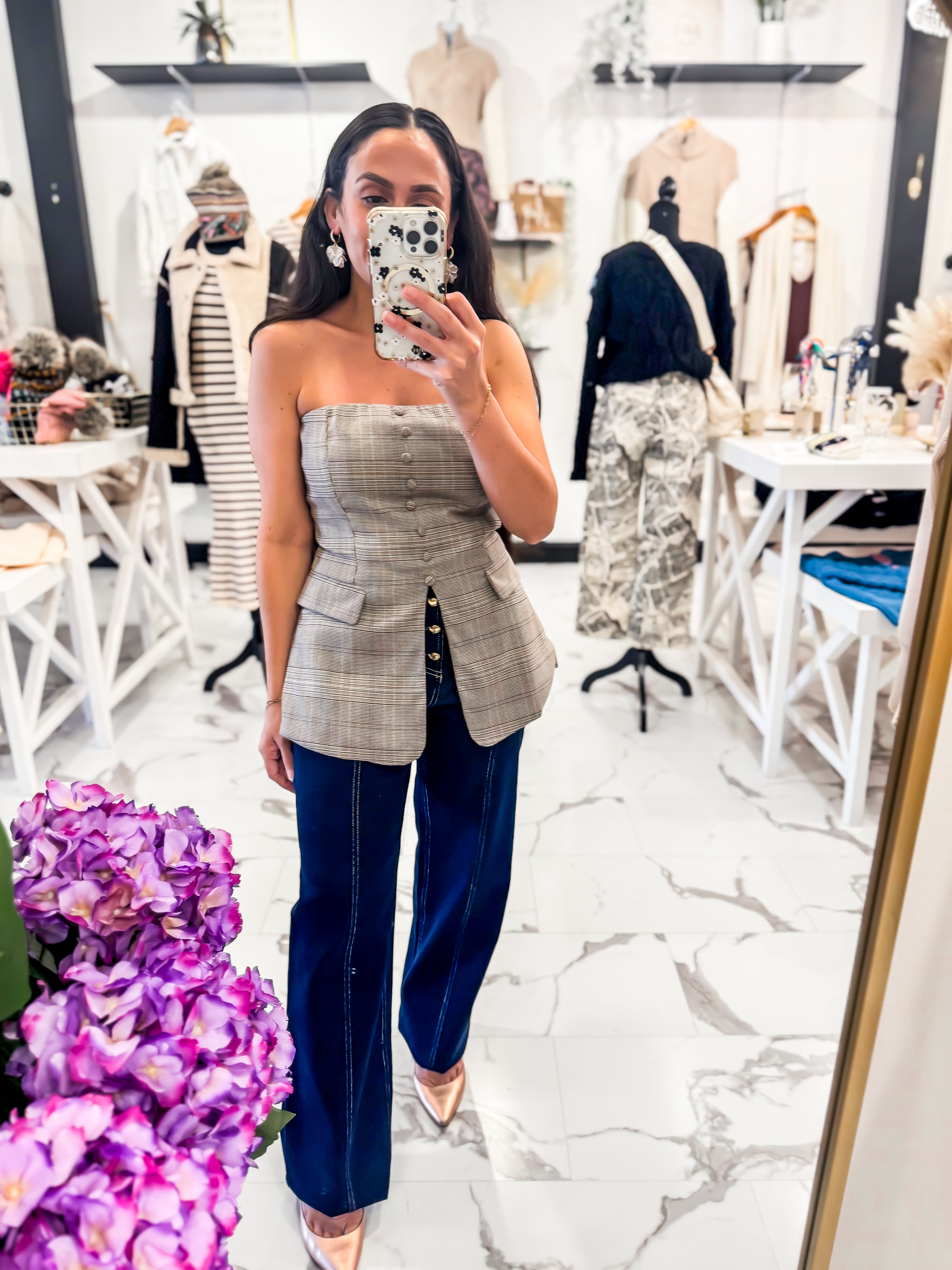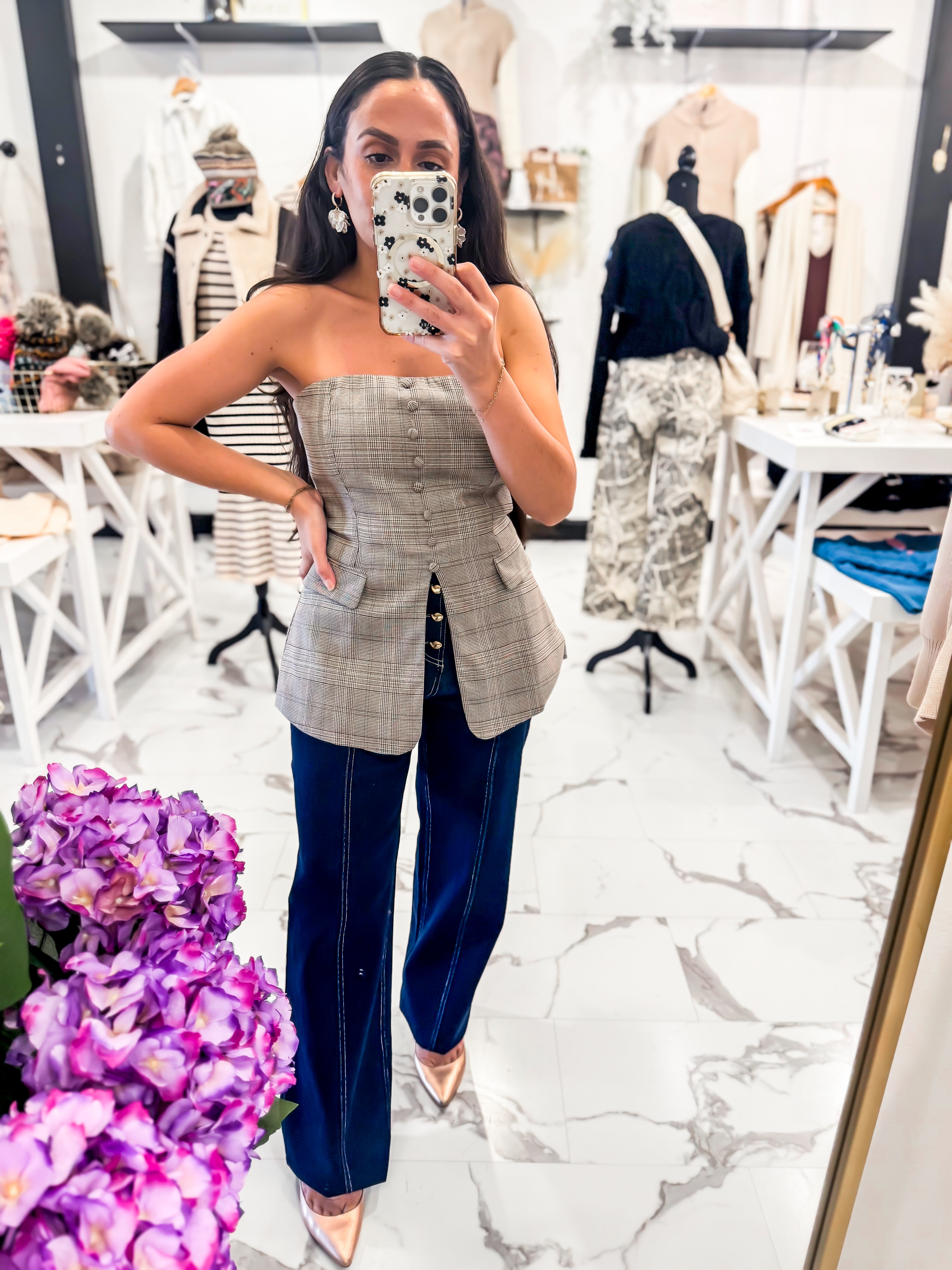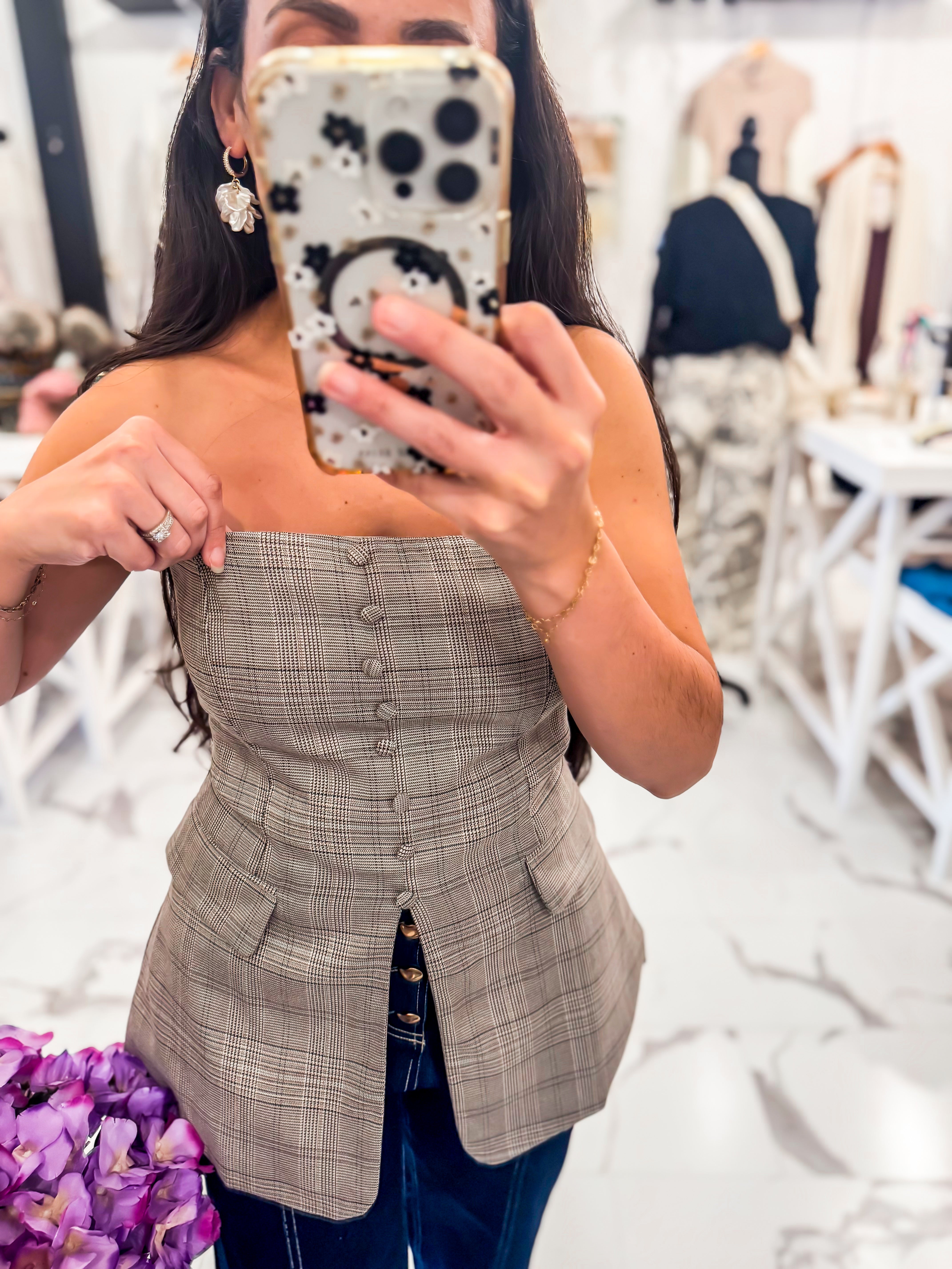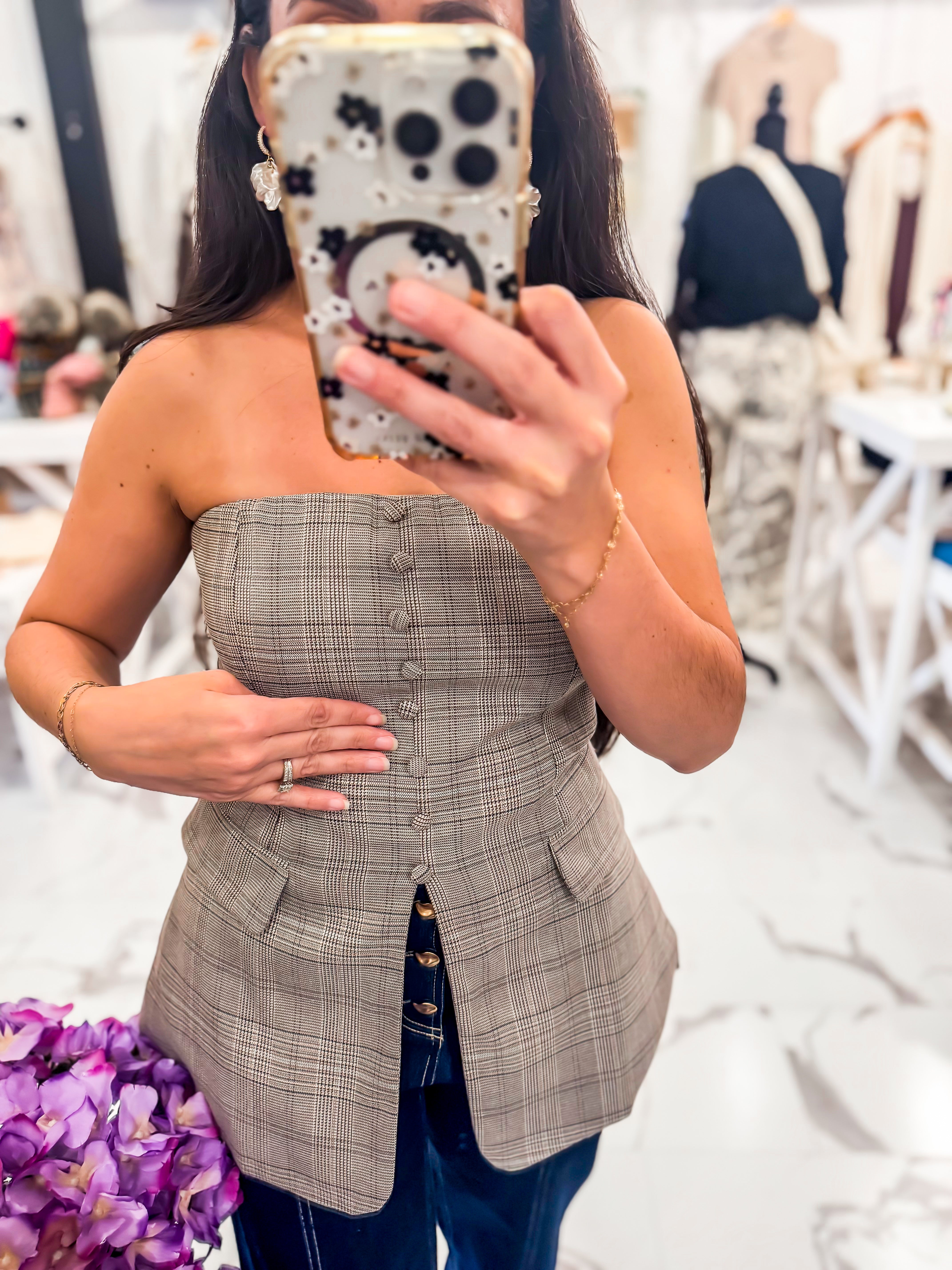 Classic tailoring meets modern femininity! The Highline Strapless Plaid Top is designed with sleek structure and timeless plaid detailing, creating a refined silhouette that still feels effortlessly cool. Featuring a faux buttons with subtle pleating and front flap pockets. This top cinches perfectly at the waist before flowing into a flattering, slightly flared hem. The strapless cut keeps it sophisticated yet playful. Pair it with our Dreaming Of You Pants, Ada Ring, Sloane Earrings, and pumps.