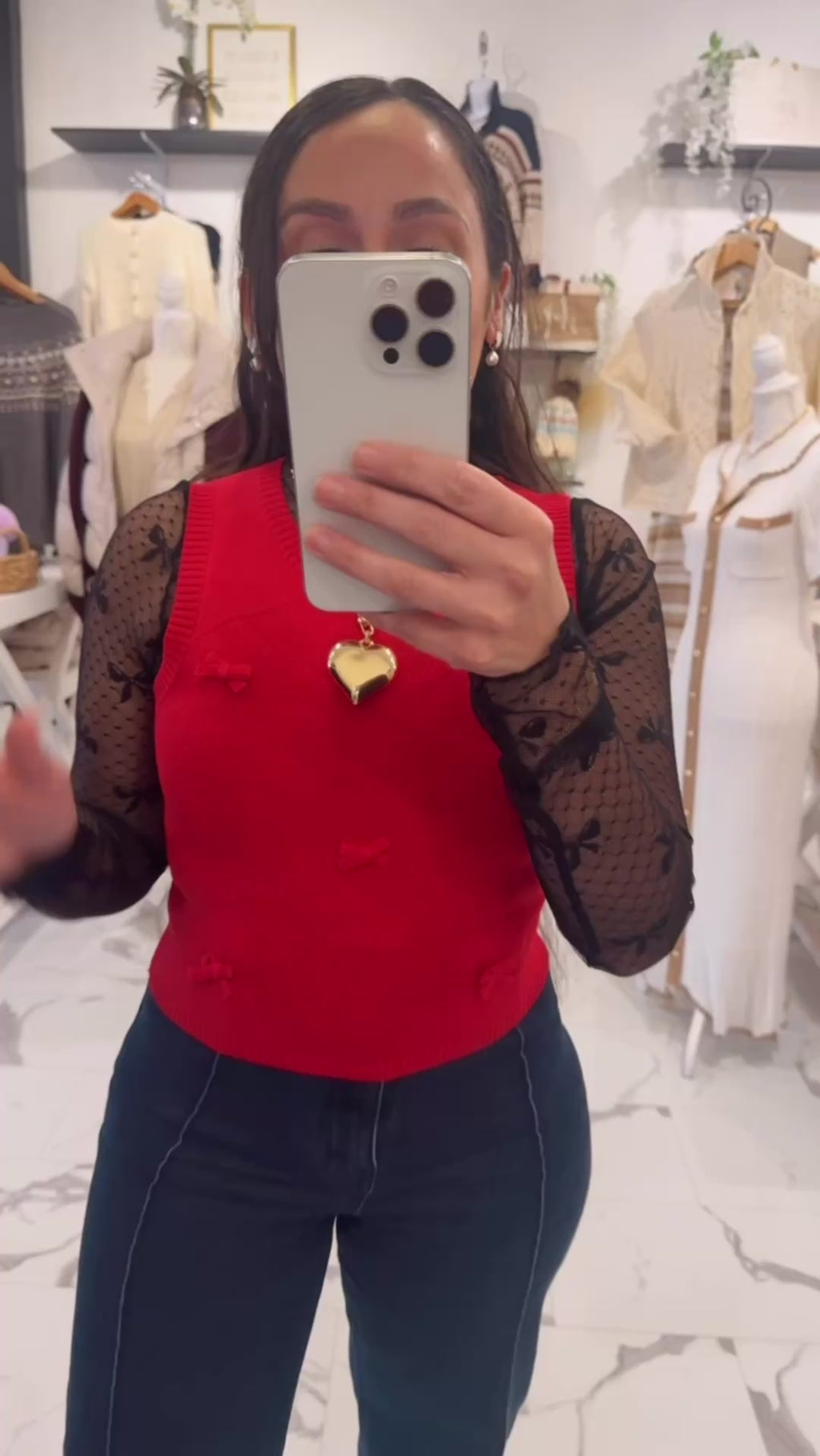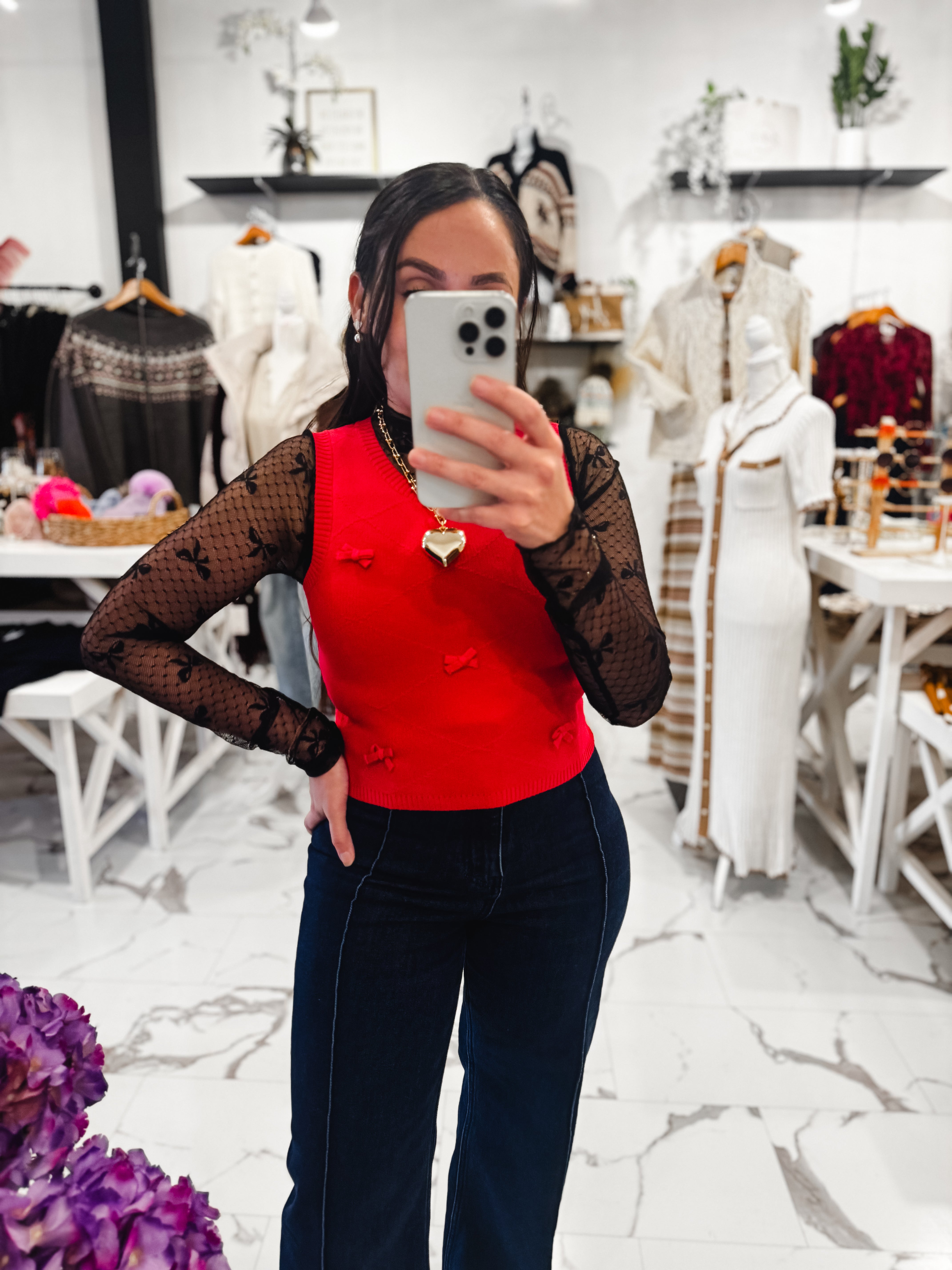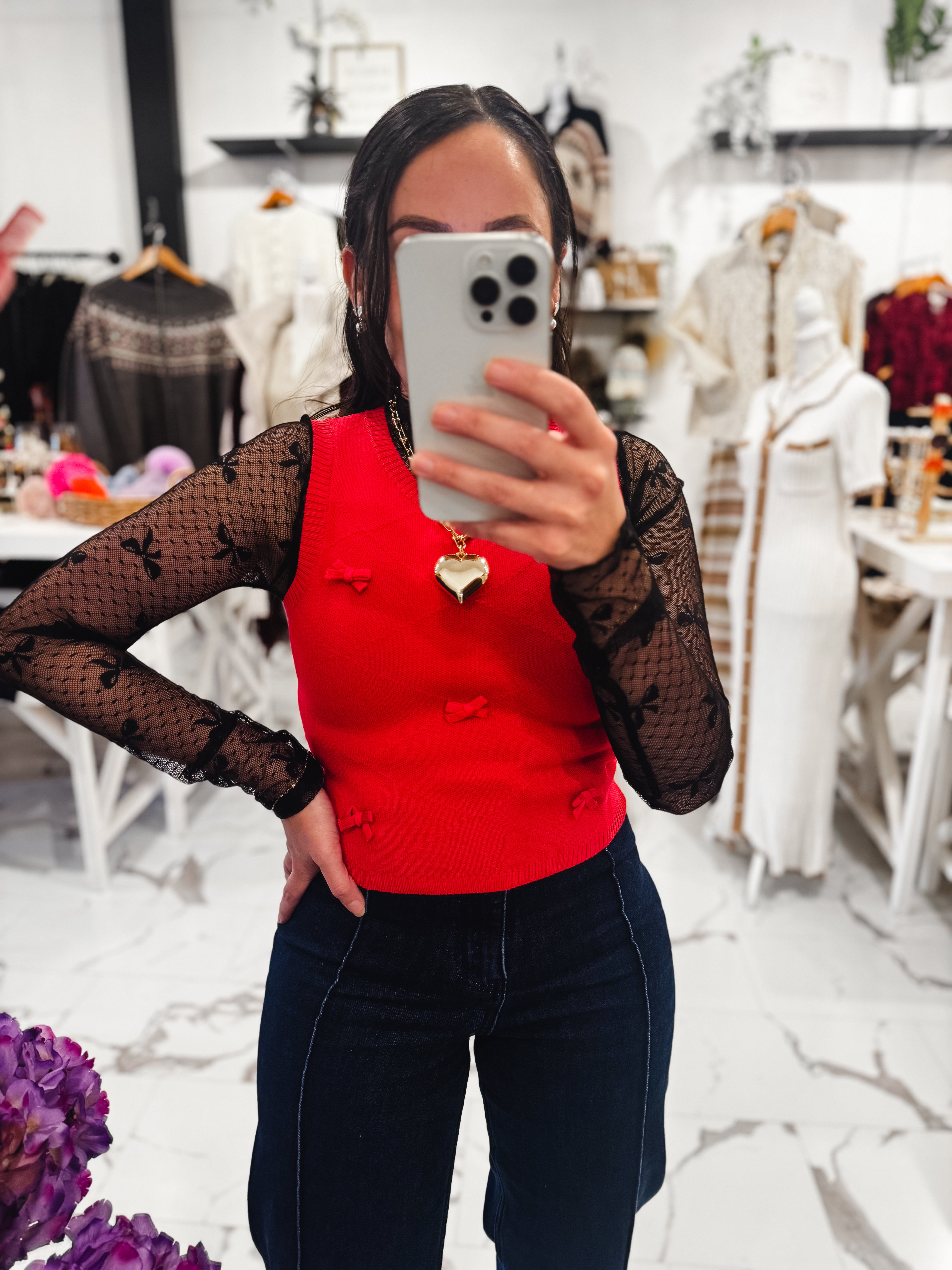 Sweet with just the right amount of attitude, the Little Bow Moment Knit Top is all about the details. This sleeveless knit features subtle diamond stitching and delicate bow accents that add a playful, feminine touch without feeling overdone. The fitted silhouette makes it easy to dress up or down. Rock this vest with our Heart On The Line Top, One Call Away Jeans, Rita Necklace, and booties.