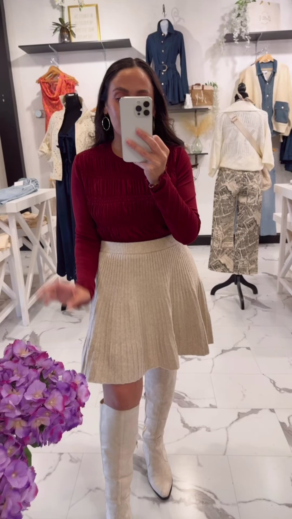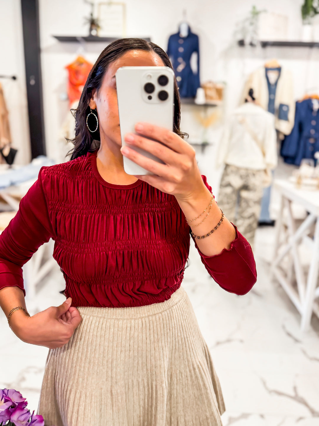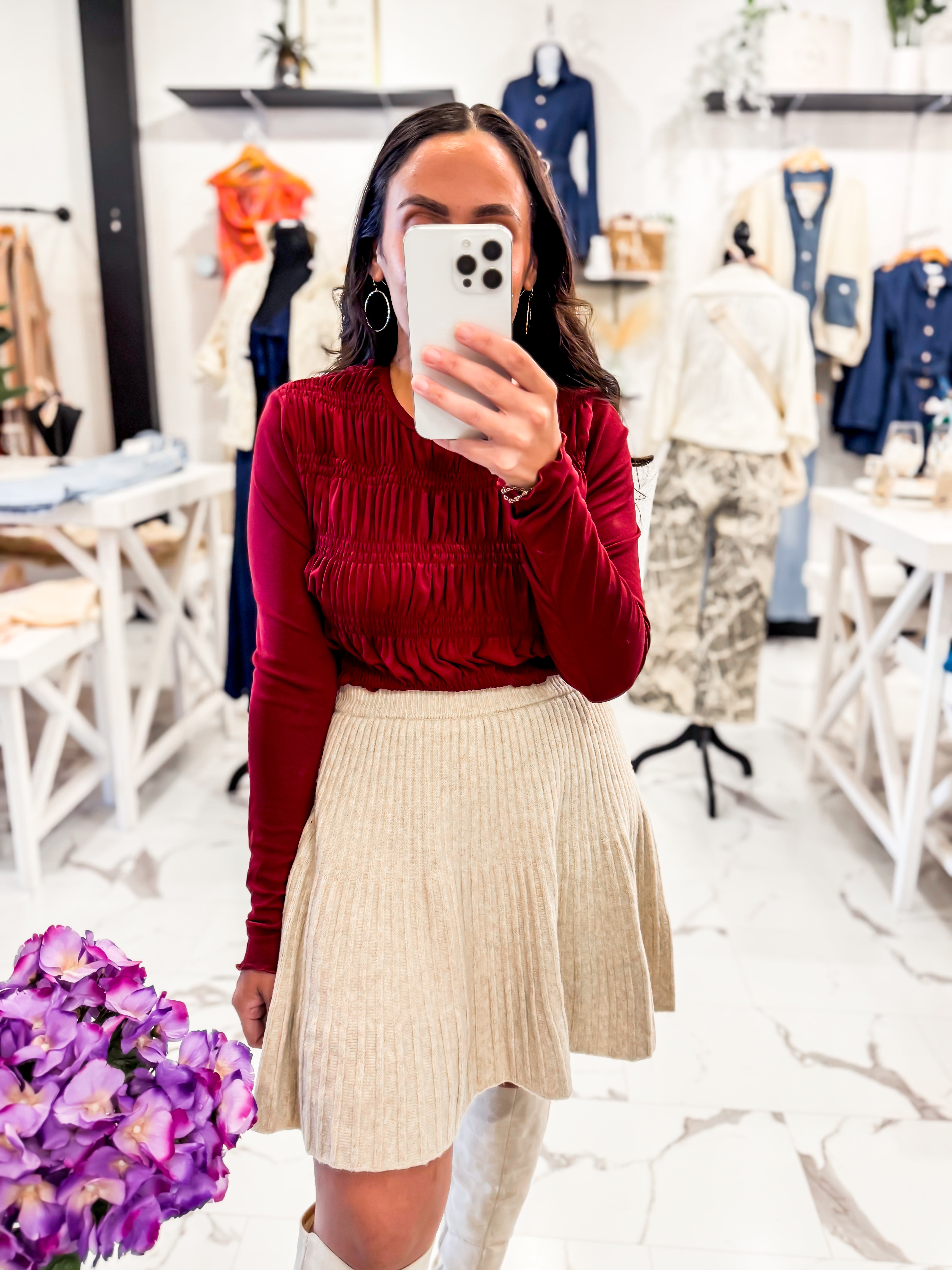 Our Merlot Ruffle Long Sleeve Top has the most beautiful deep red color! Featuring a ruffle pattern throughout. Designed with a soft, stretchy fabric that will keep you cozy and comfortable. Pair it with our Good For Me PantsAngela Ring, and boots.