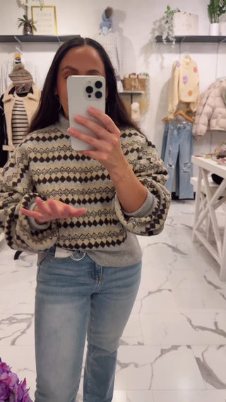 Cozy, classic, and effortlessly chic, this printed sweater brings all the winter in Paris charm! Designed in a soft light grey knit with a timeless geometric pattern, it features a relaxed silhouette with slightly ballooned sleeves for that subtle statement you love. The mock neckline adds a touch of sophistication while keeping you warm, making it perfect for chilly days and your go to denim. A blend of neutral tones keeps the look polished, versatile, and ideal for dressing up or down all season long. Rock this sweater with our After Dark Skirt, Mona Ring, and booties.