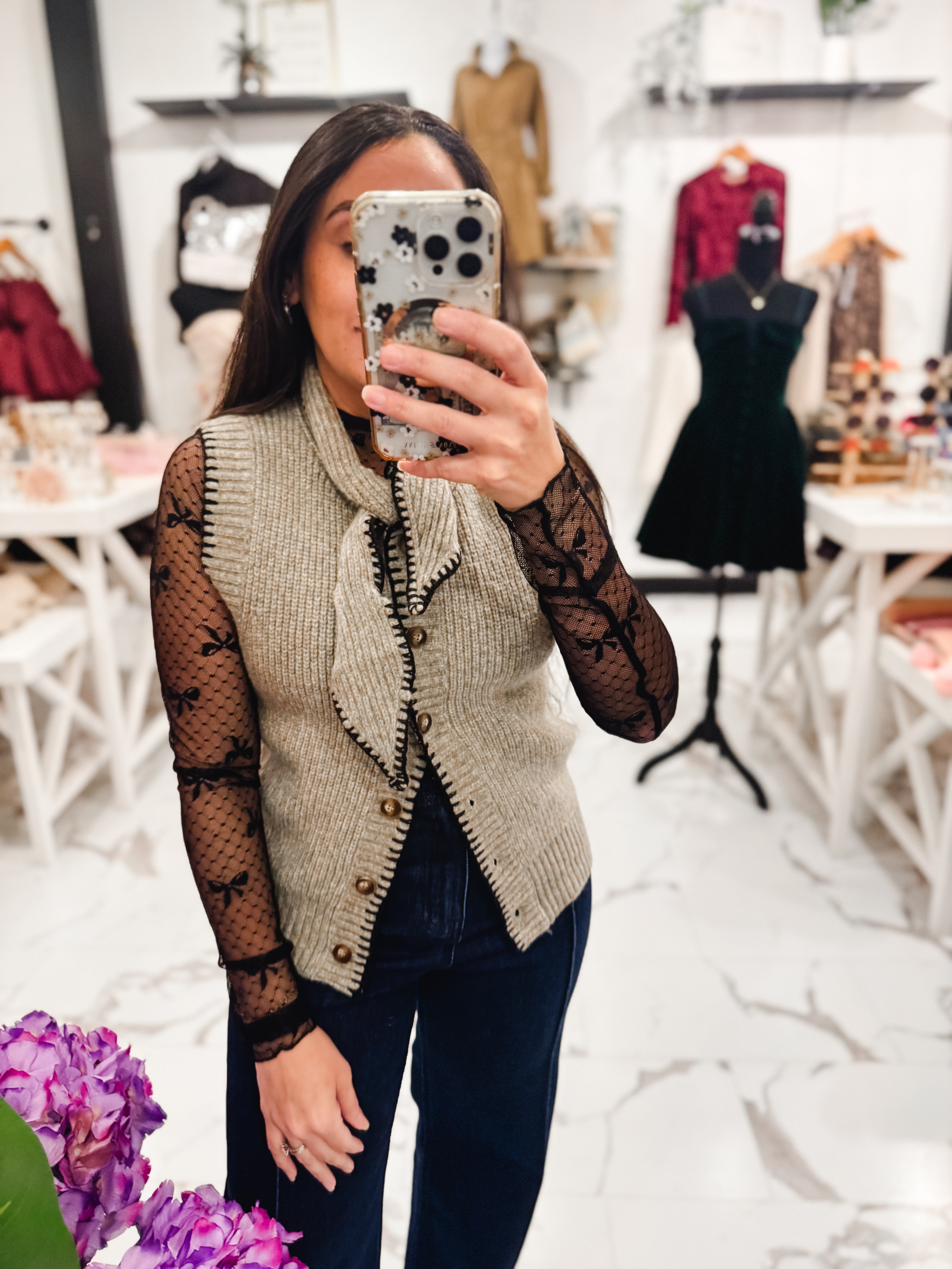 Soft, cozy, and just a little unexpected! This sweater vest is anything but basic. The chunky knit texture pairs perfectly with the statement tie neckline and contrast stitching for a look that feels effortlessly styled without trying too hard. Designed to be worn solo or layered, it’s the kind of piece that instantly upgrades your denim days and casual outings. Rock this vest with our Heart on the Line Top, Solstice Trousers, Julia Earrings, Maya Bracelets, and booties.