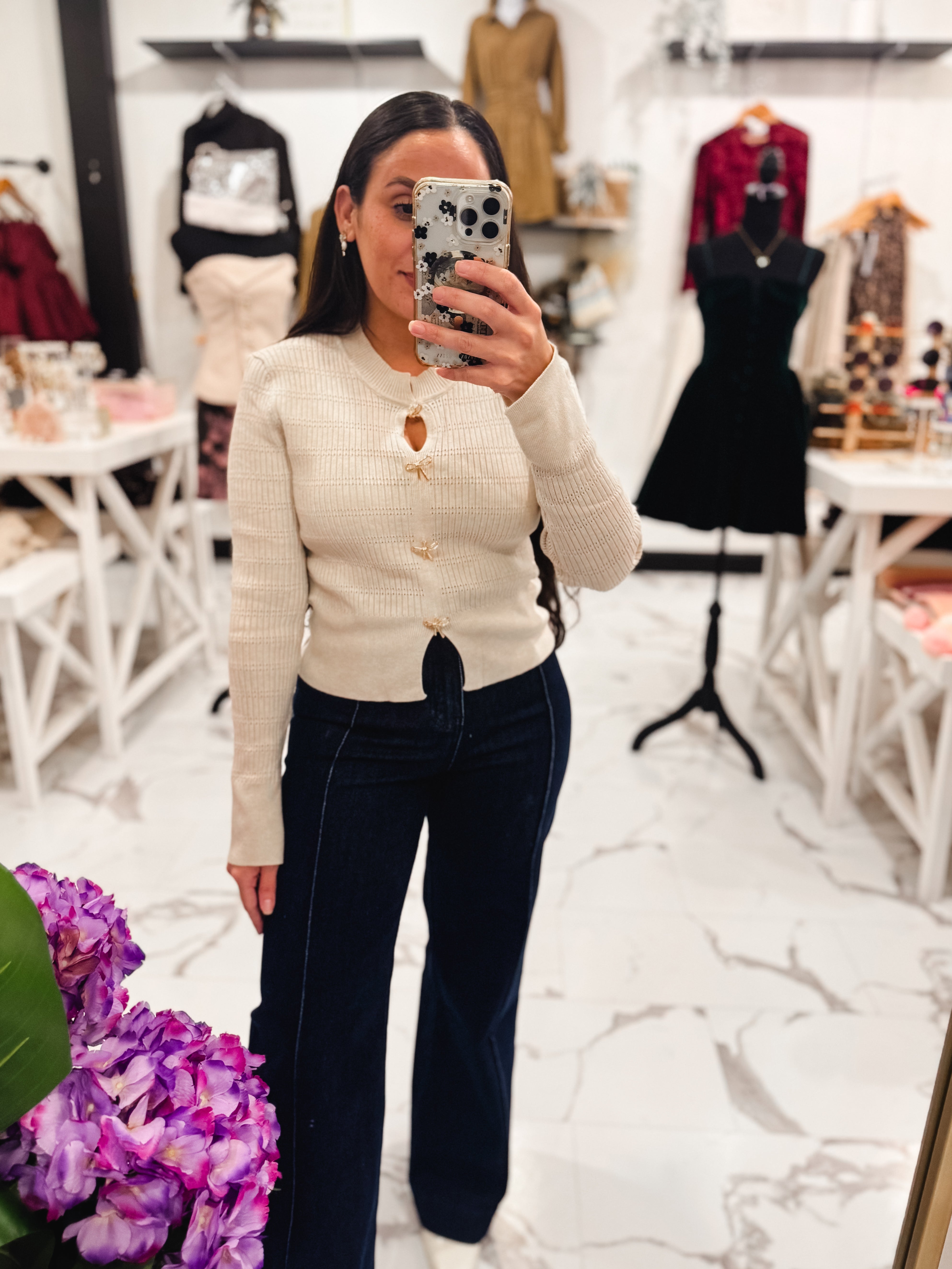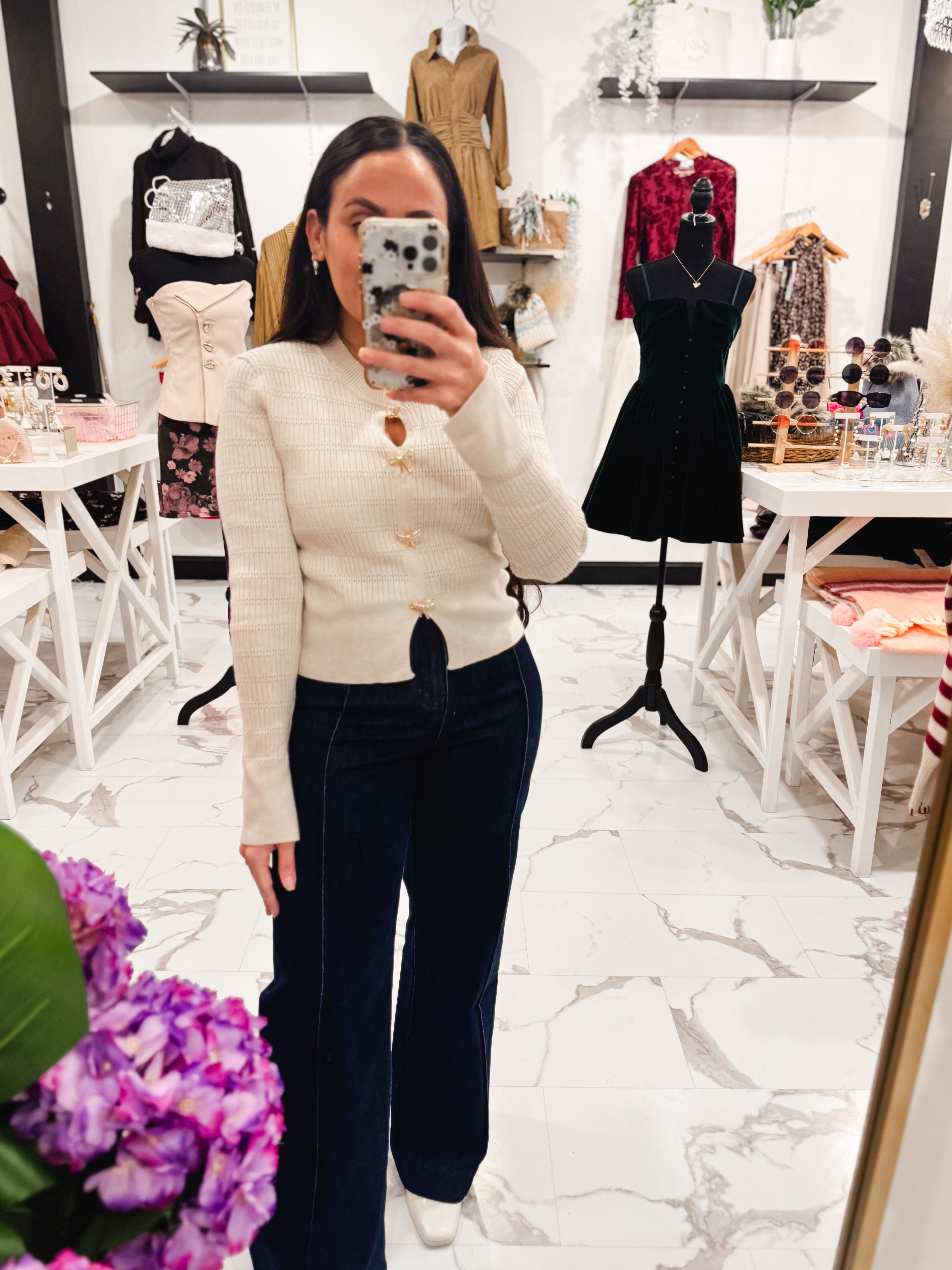 Meet your new go to denim when you want to look put together without trying too hard! The One Call Away Denim Pants feature a flattering high rise waist with a clean, structured fit through the hips and a relaxed wide leg silhouette that elongates the legs beautifully. The dark wash keeps things polished and versatile, making these just as easy to dress up with heels as they are to wear casually with boots or flats. Designed with subtle seam detailing and a tailored feel, these jeans give effortless confidence from day to night. They’re the kind of denim you reach for when you want to feel sleek, comfortable, and instantly styled, no second guessing required. Pair with our Busy Woman Sweater, Parker Necklace, and boots.
