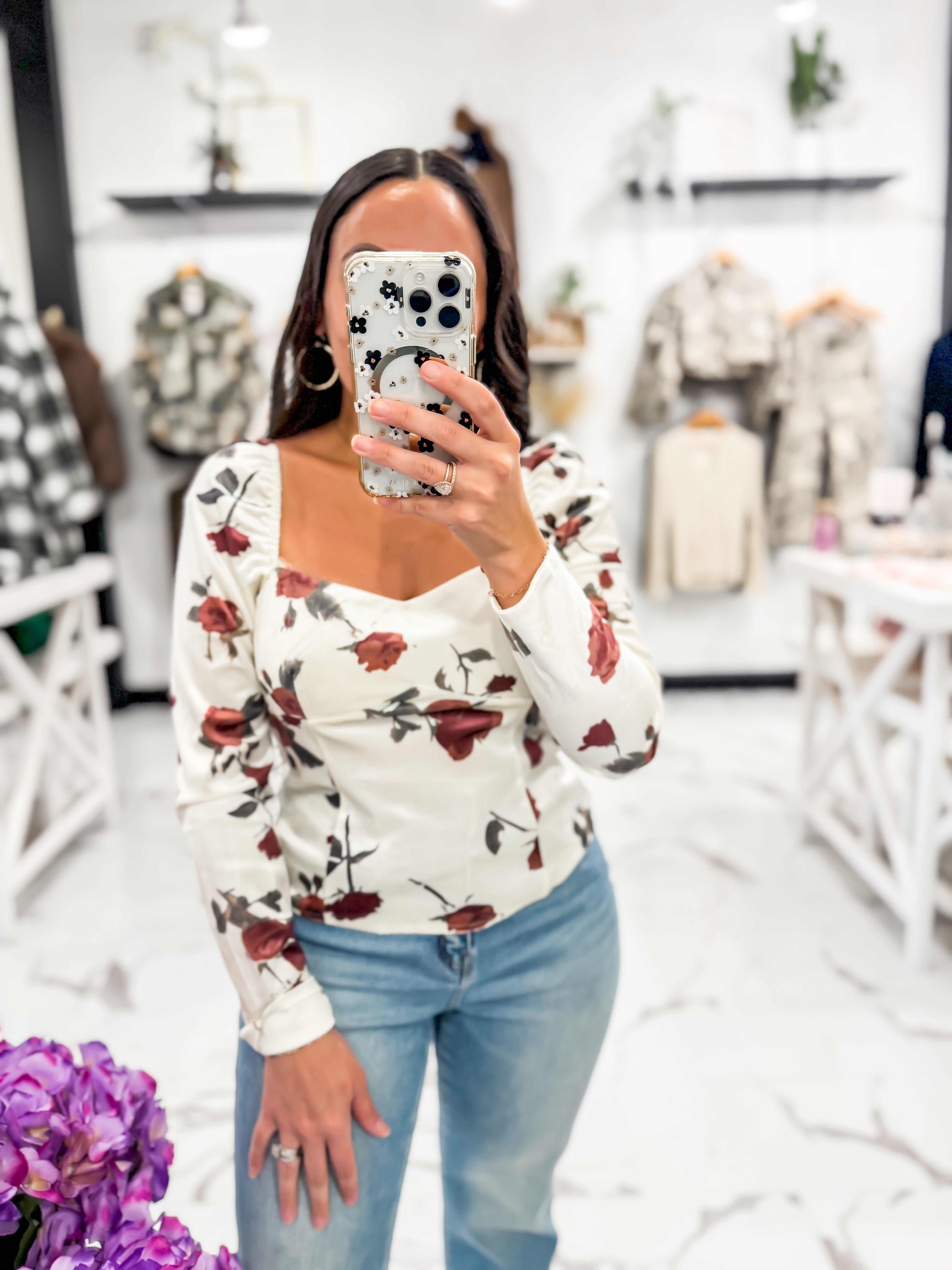 Soft, romantic, and effortlessly flattering! Our She’s So Elegant Long Sleeve Top is one of those pieces that instantly elevates your look. Designed with a delicate floral print on a creamy base, this top features a feminine square neckline and gently contoured fit that hugs in all the right places. The long sleeves add balance and versatility, making it perfect for layering now and wearing solo as the seasons change. Pair this top with our Iconic It Girl Trousers, Tessa Earrings, Elliana Earrings, and heels.