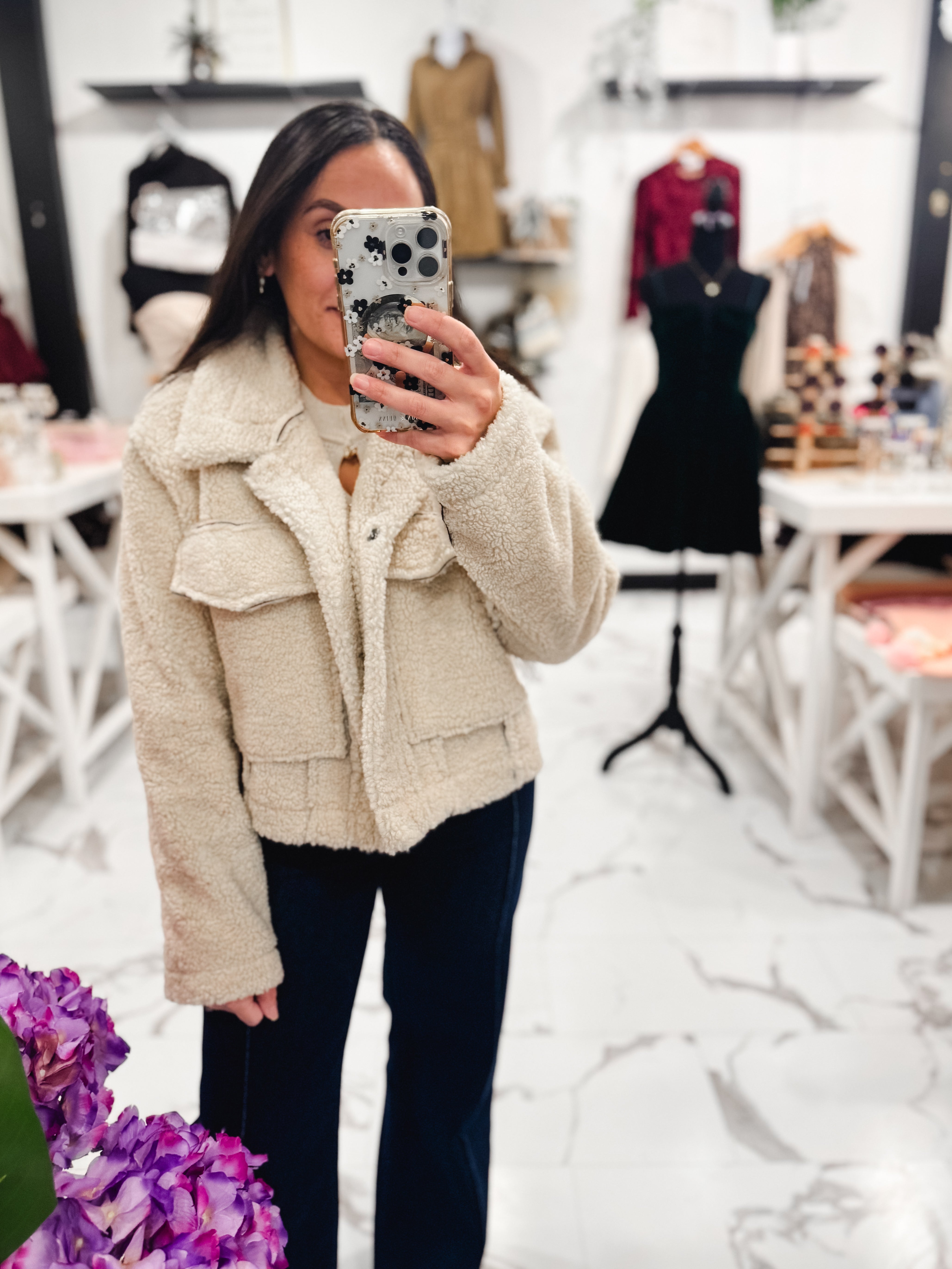 When cozy meets chic, say hello to the Timberline Sherpa Jacket! This plush statement layer brings a touch of mountain charm to city streets with its black faux suede exterior and contrasting cream sherpa lining. Designed for warmth and attitude, it features an oversized collar, exposed seam details, and a relaxed boxy fit. Rock this jacket with our Weekend Escape Jeans, All She Is Top, Pretty Simple Beanie, and sneakers.